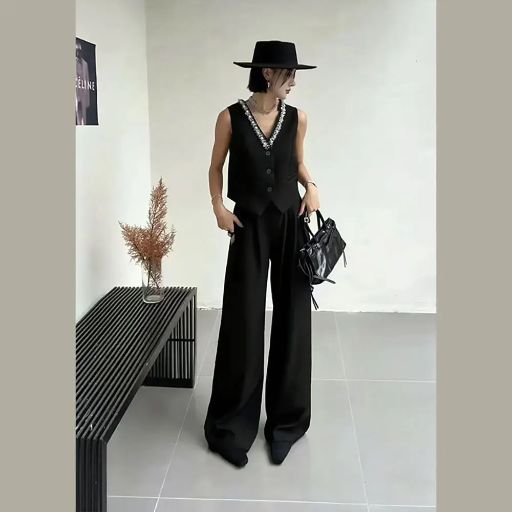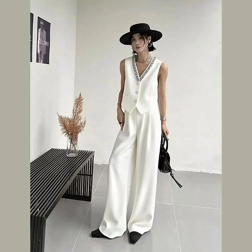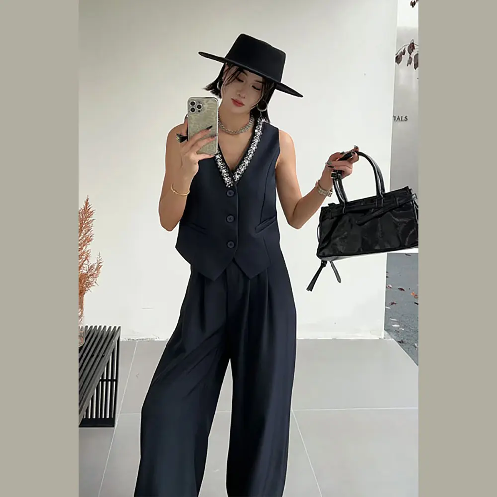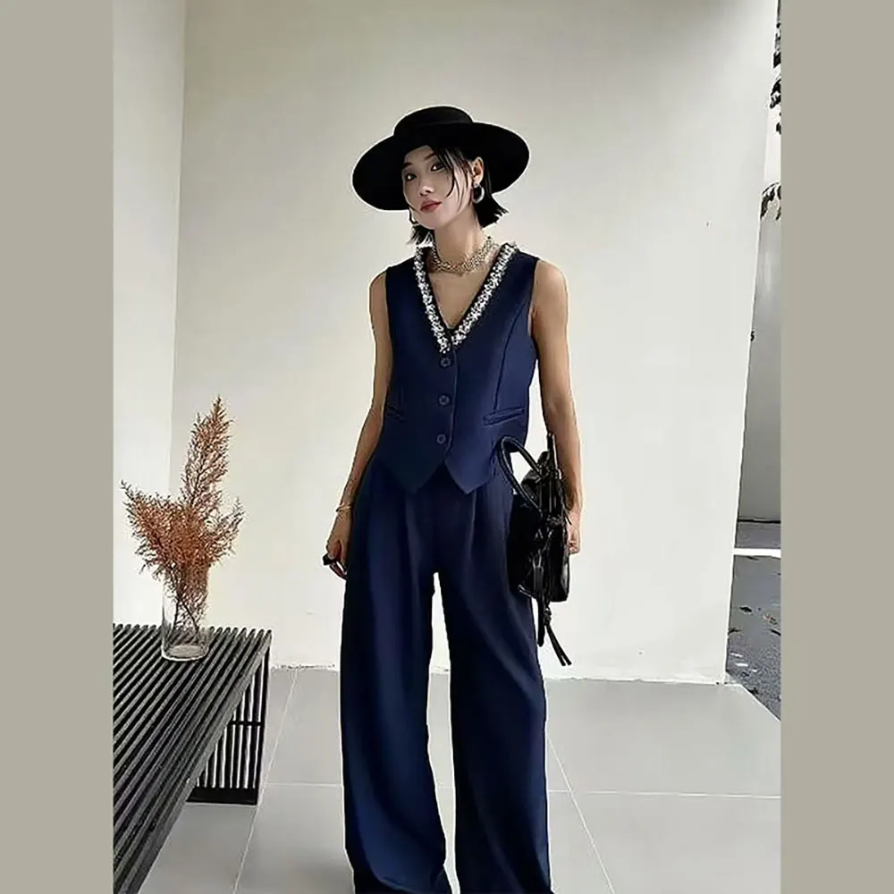 Women's Two-Piece Suit Set - Suit Fabric, Beaded Vest & Pants, Versatile Style, with Lining