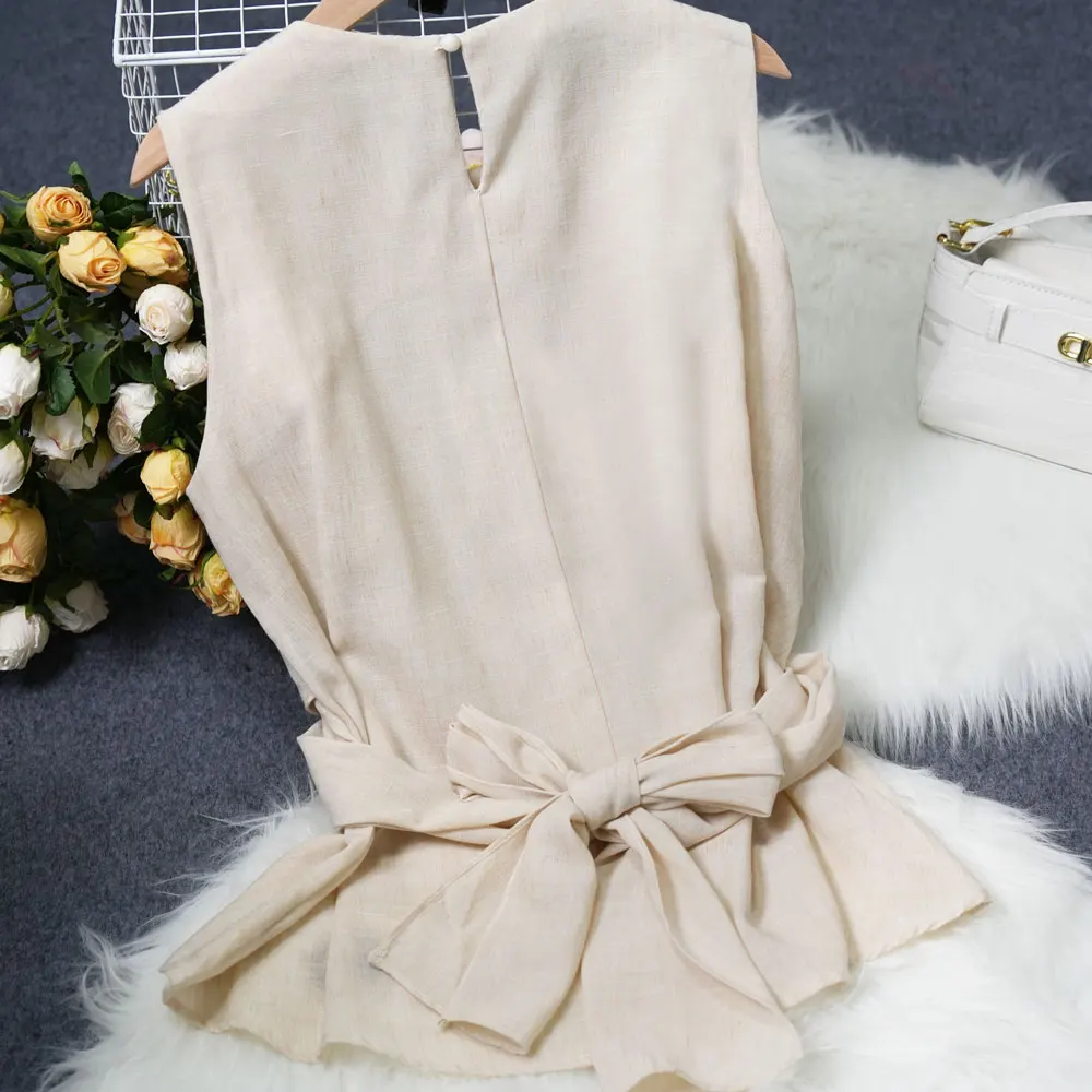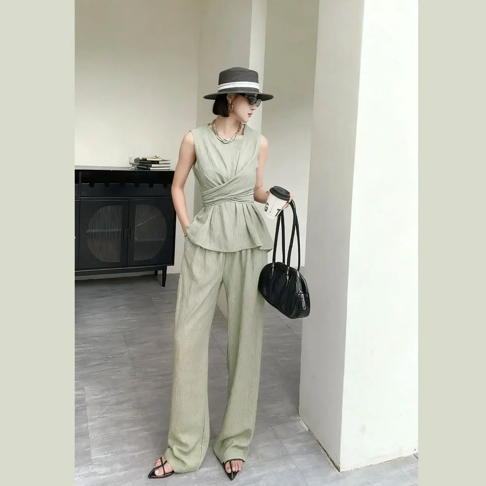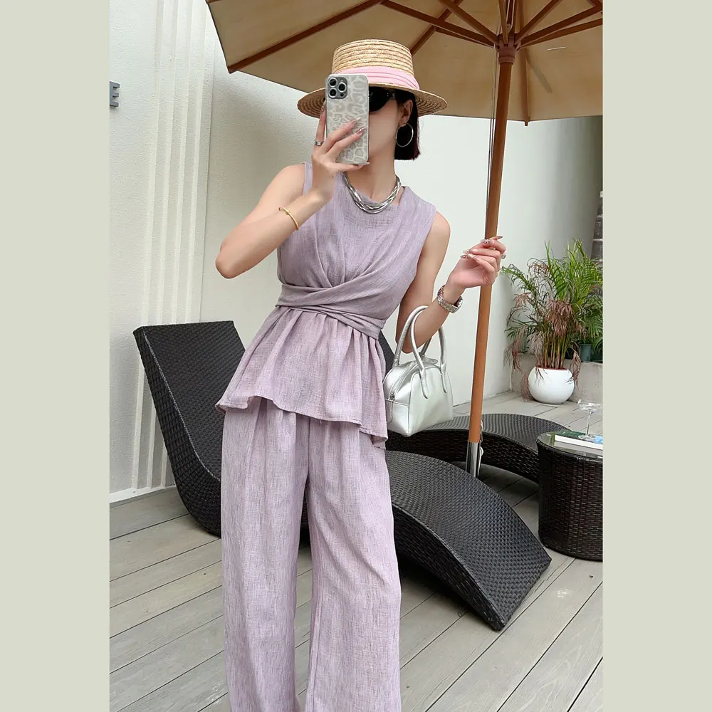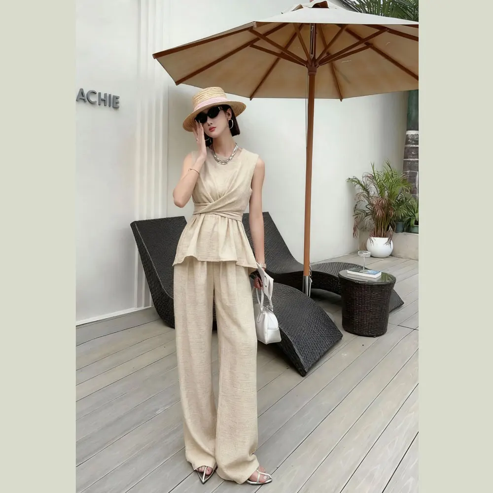 Women's Linen Fabric Two-piece Set - French Style Belt Design Versatile and Comfortable