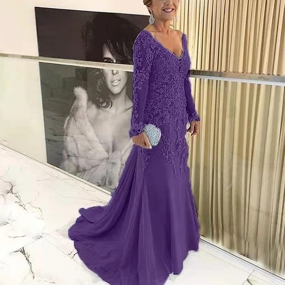 Elegant Blue Silver Mother of the Bride Dresses Long Sleeve 2022 V Neck Godmother Evening Dresses Wedding Party Guest Gowns New