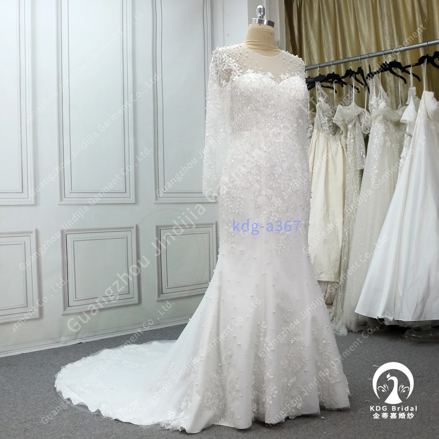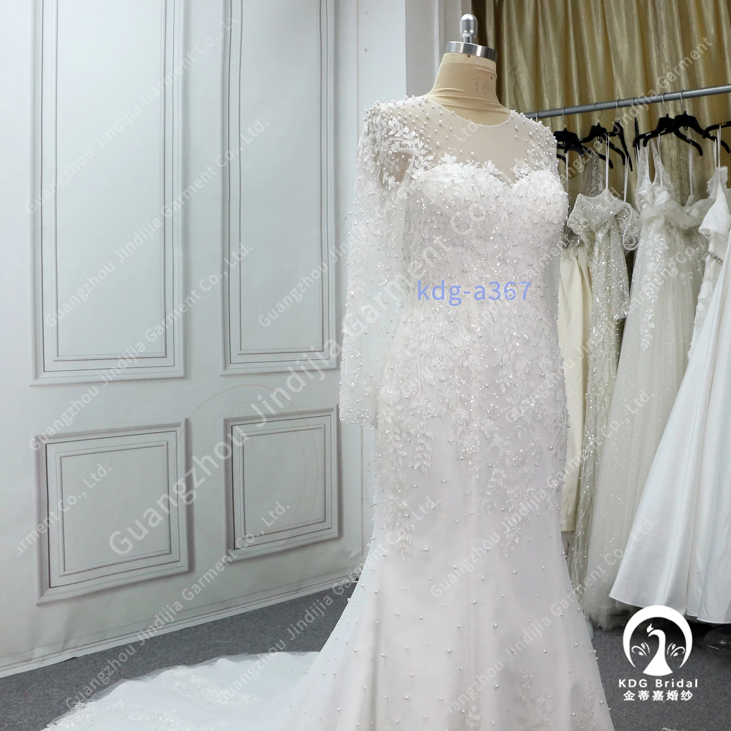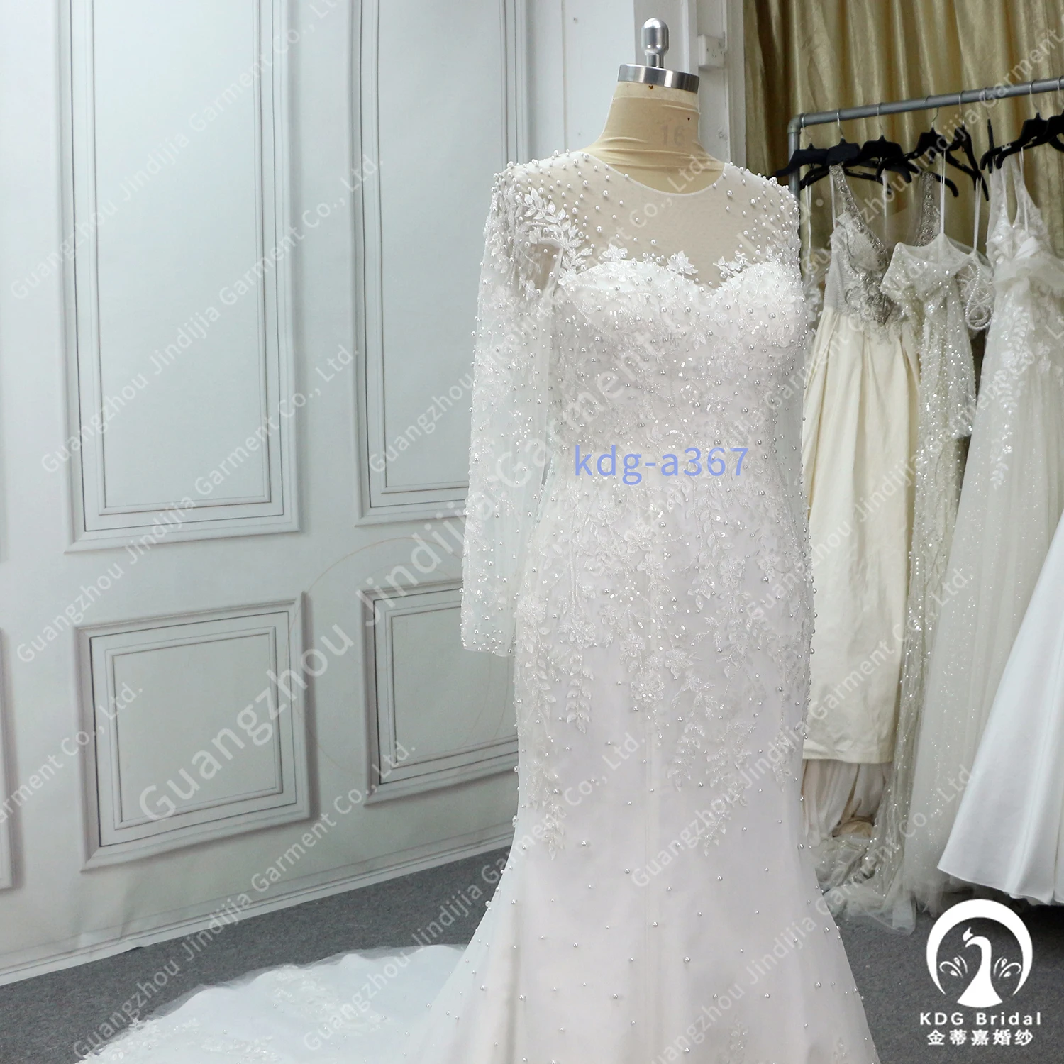 Sexy Custom Plus Size Made Luxury Pearl Lace Long Sleeves Beading Full Women Lace Elegant Gowns Mermaid With Bride Wedding Dress