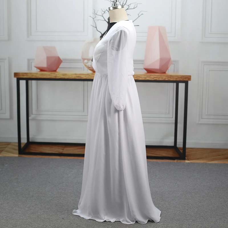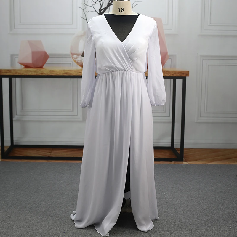 Plus Size Evening Party Bridal Gowns Prom Simple High Slit Long Sleeves Backless Sexy Soft Satin V-neck A-line Wedding Dresses