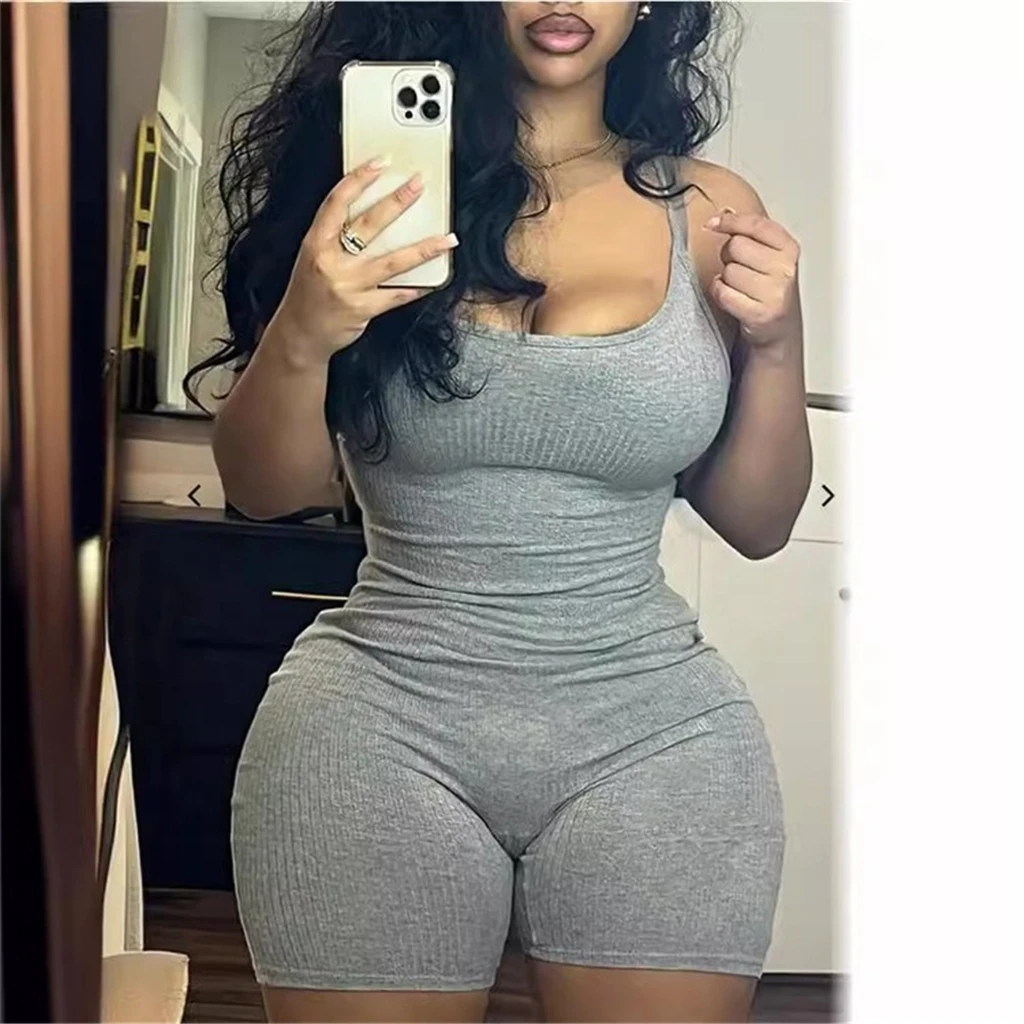 2208 Ami Rib Knit Romper Women Sleeveless Spaghetti Strap Plain High Elasticity Daily Women One Pieces Short Jumpsuits