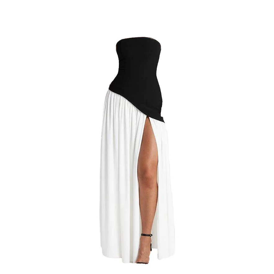 4651 Women's Strapless A-Line Floor-Length Summer Maxi Dress Low Back High Slit Sash Tie for Evening Party Wear