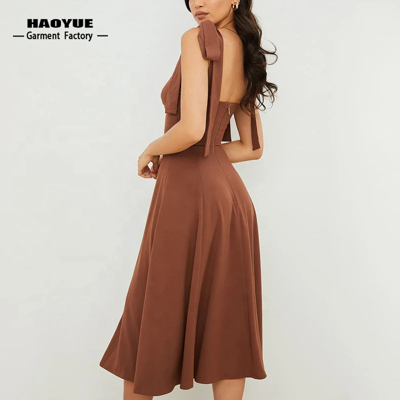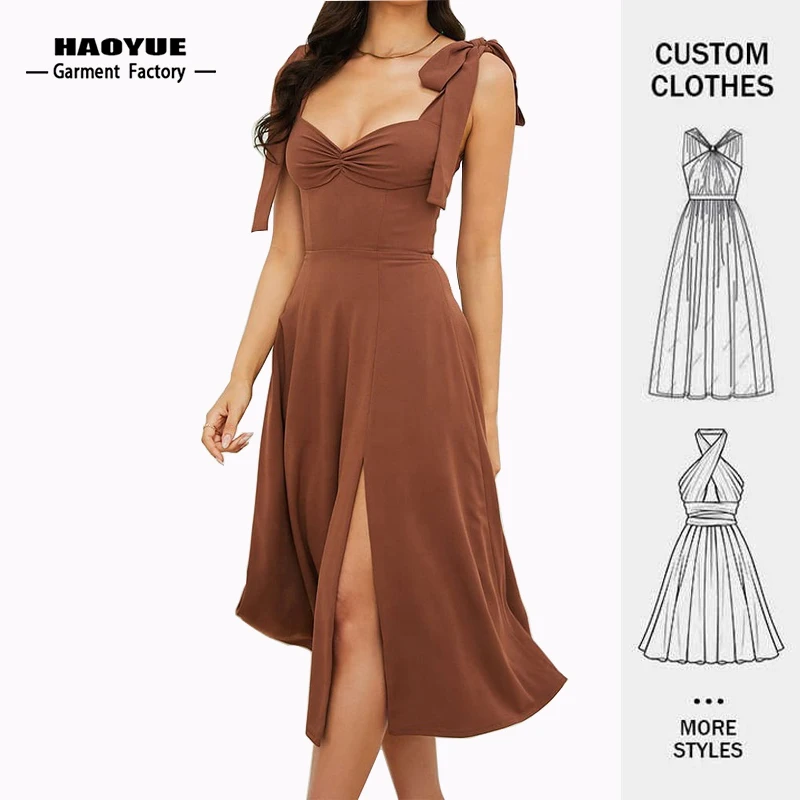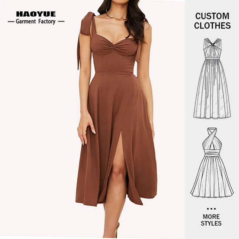 Womens Clothing Manufacturer Custom Elegant Casual a Line V Neck Midi Party Dresses Ruffle Slit Slip Dress for Ladies