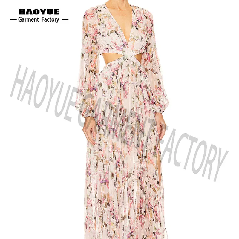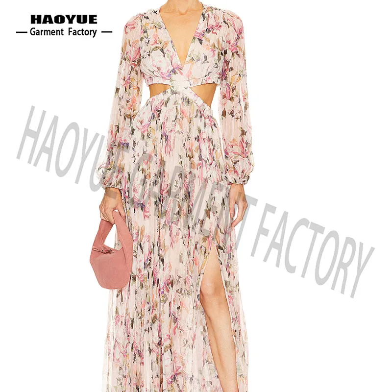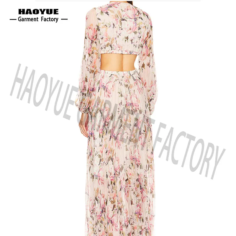 Casual Floral Printed Maxi V-Neck Dresses Rayon Crepe Chiffon Linen Pleated Weaving Woven Fabric Digital Printing Shirt