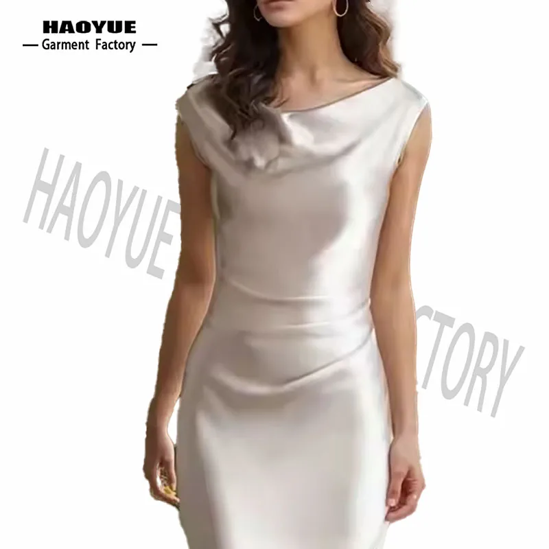 Elegant Satin Women's Maxi Dress with Boat Neck Ruching Casual Summer Evening Clothes Digital Printing Wholesale Supply