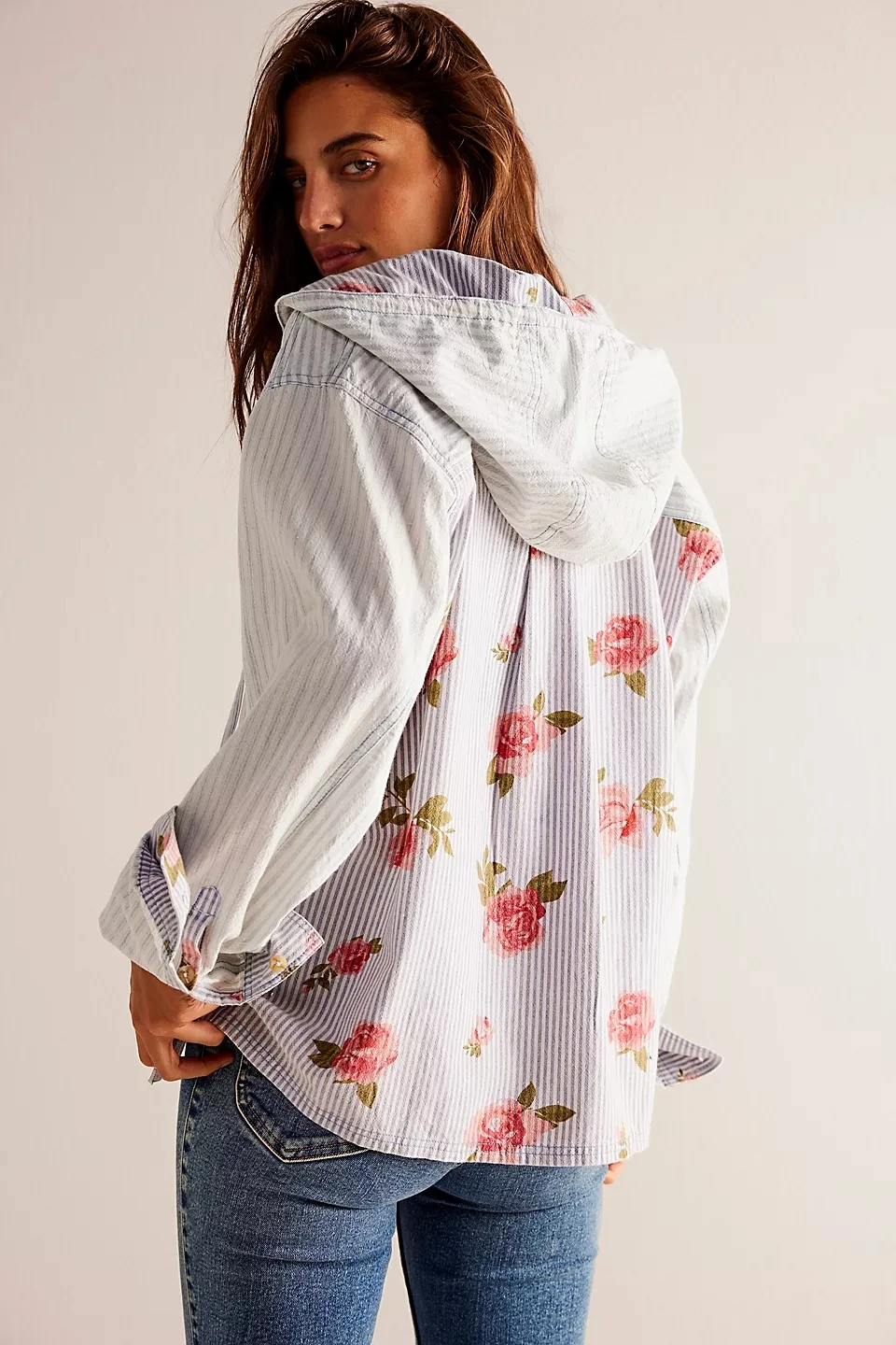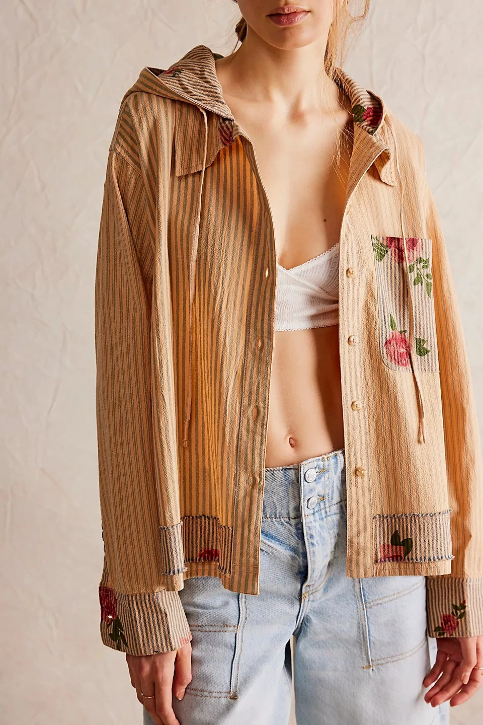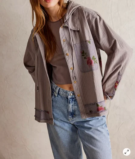 Women's Fashion Casual Striped Floral Hoodie Shirt Loose Fit Side Slits Hood Patch Pocket Waterproof Breathable 100% Cotton