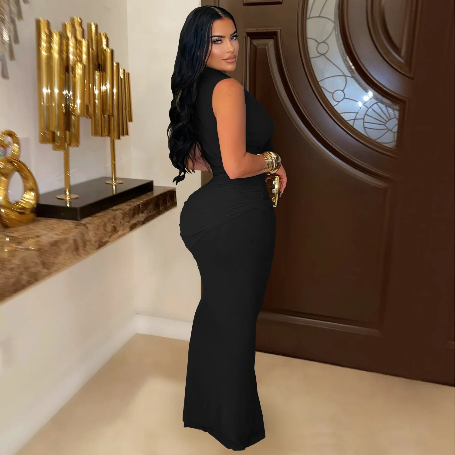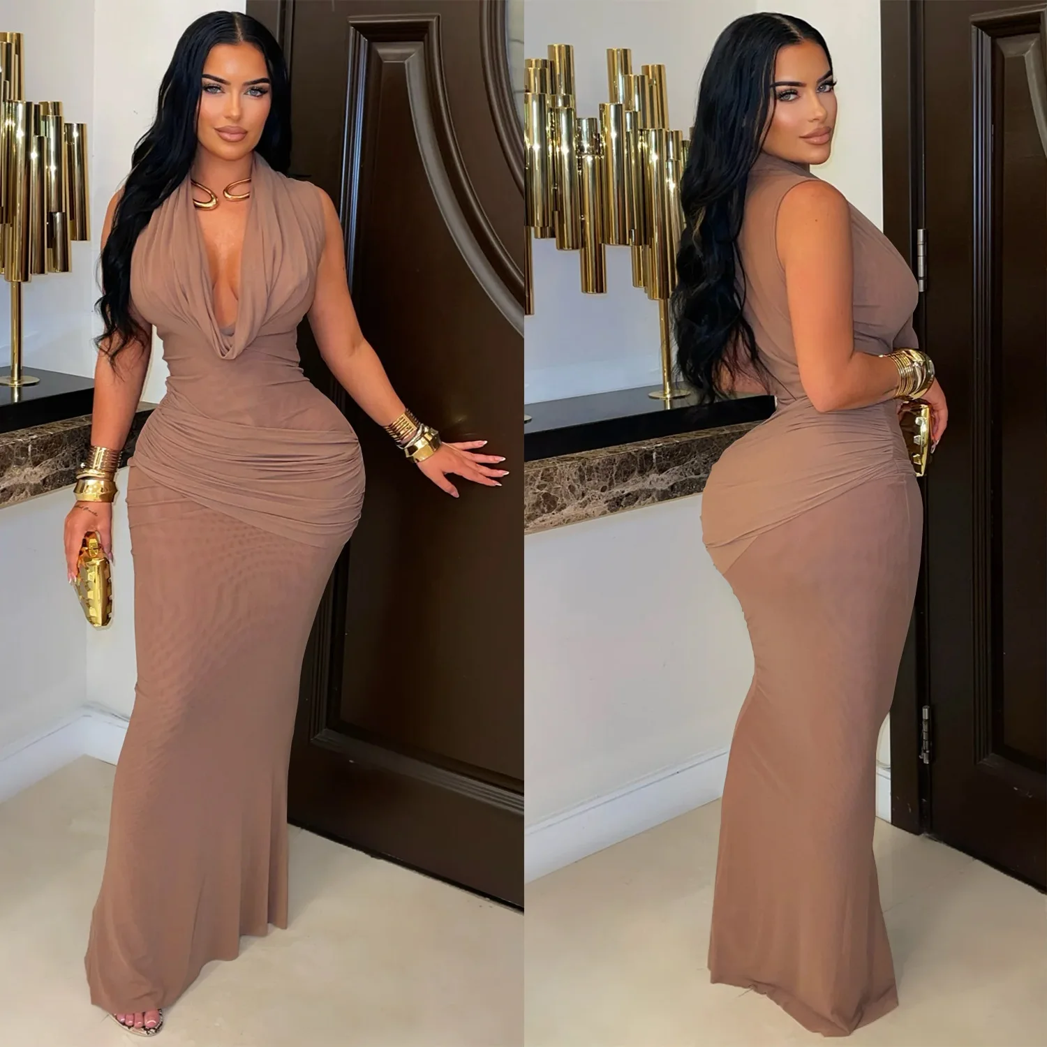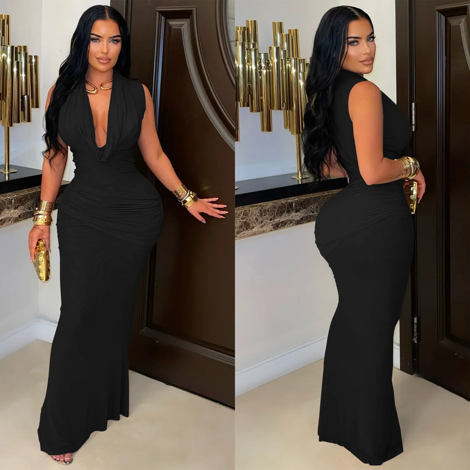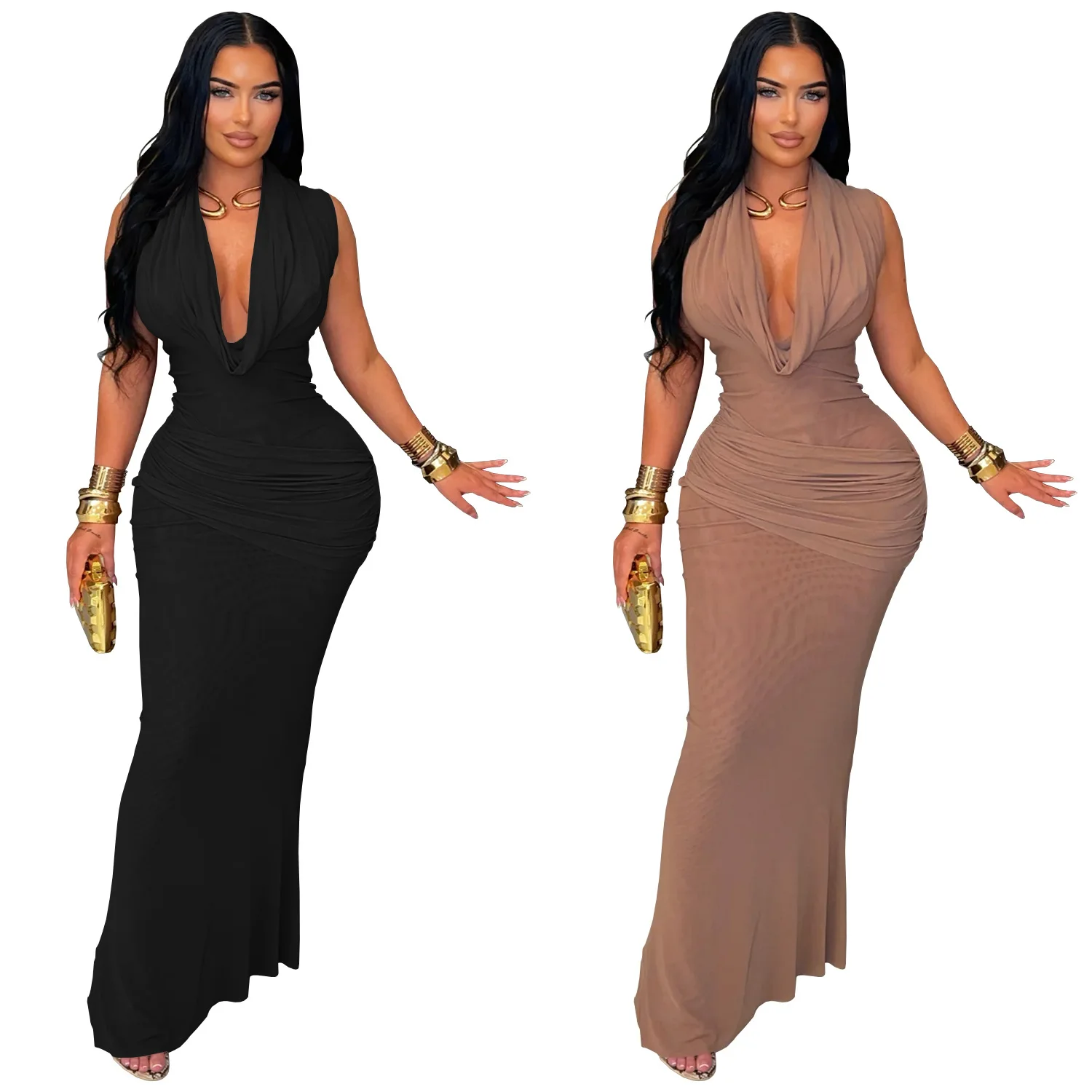 Ladies New Solid Color Sexy Deep V Neck Sleeveless Backless Halter Open Back Split Elegant Fashion Sexy Women Dress