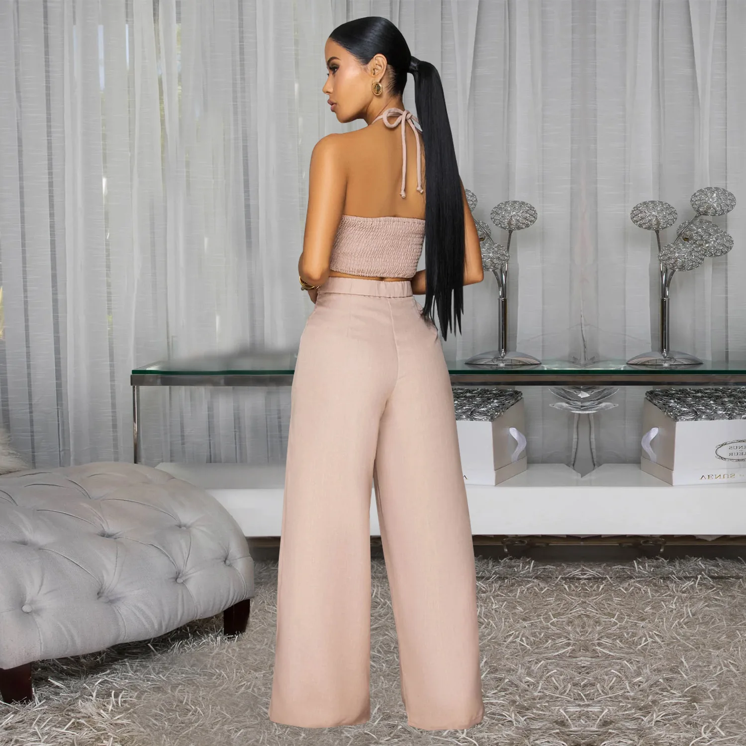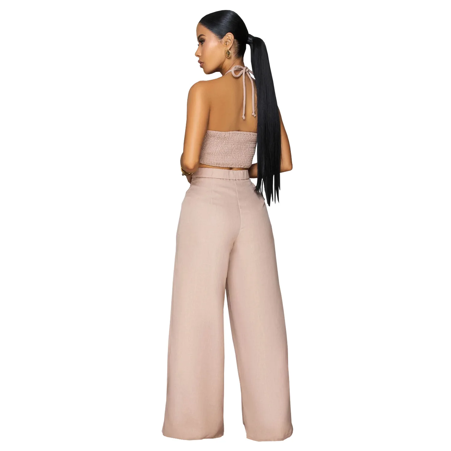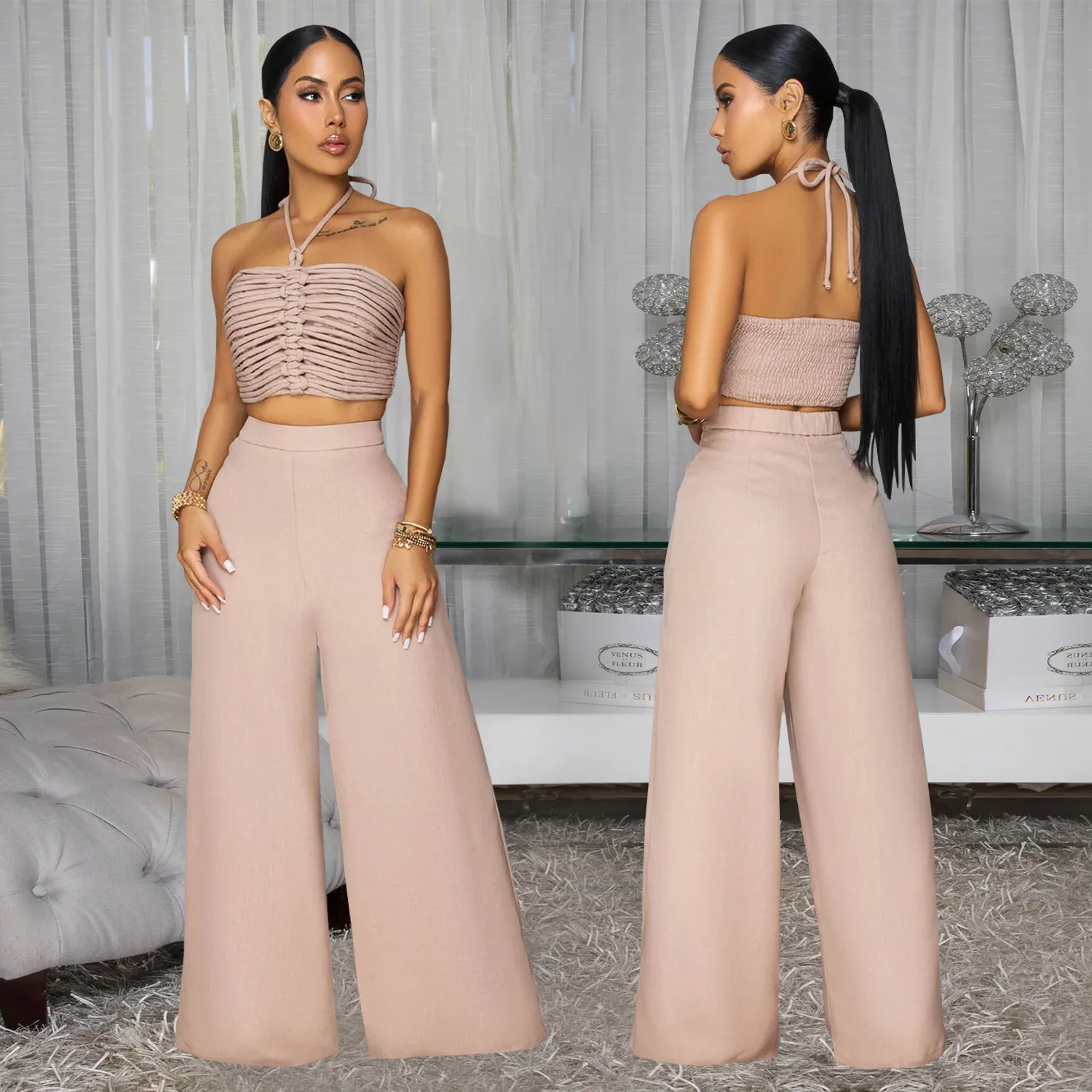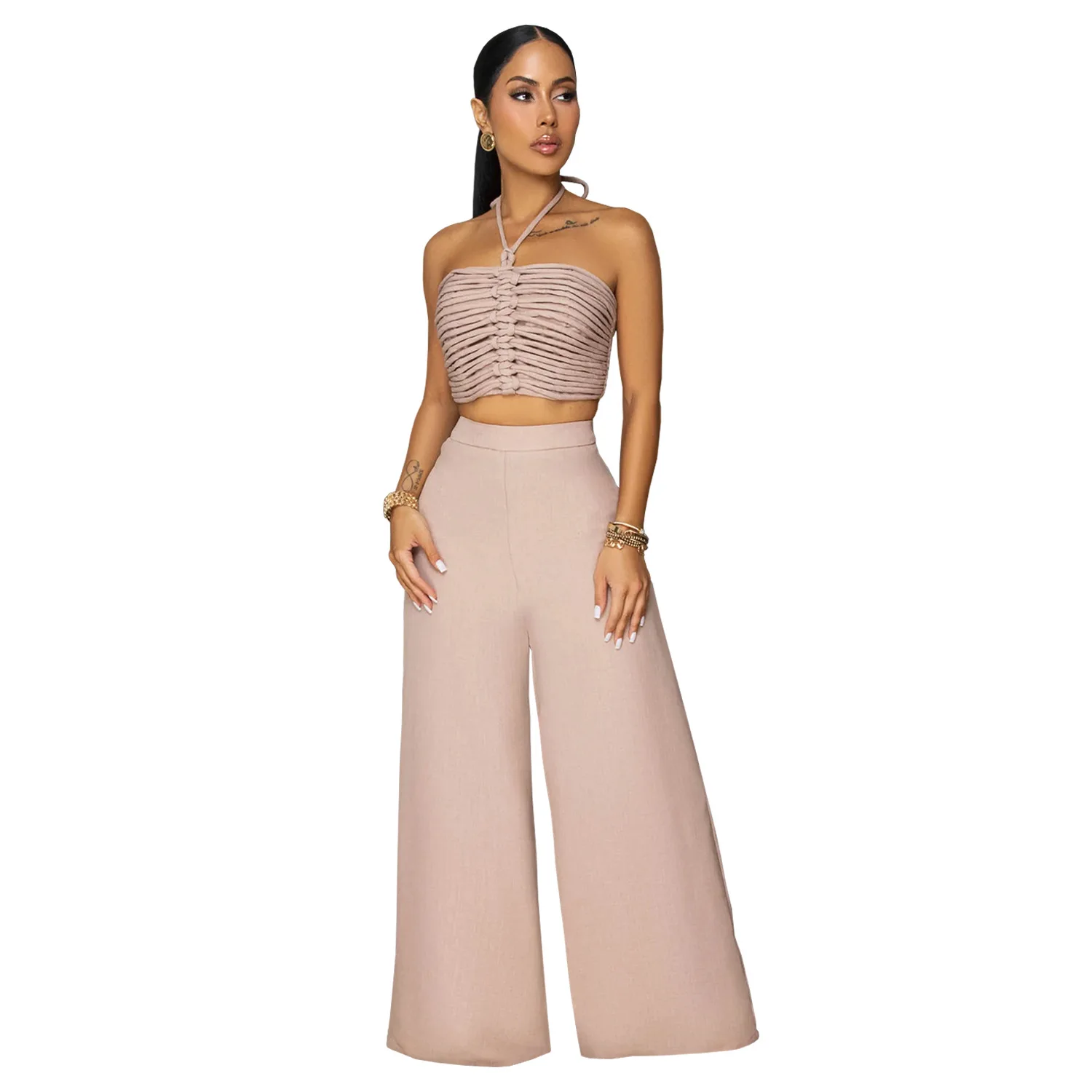 High Quality Summer Suits for Women Plain Pleated Design Cropped Top Halter Long Wide Leg Pants Two Piece Sexy Set Women