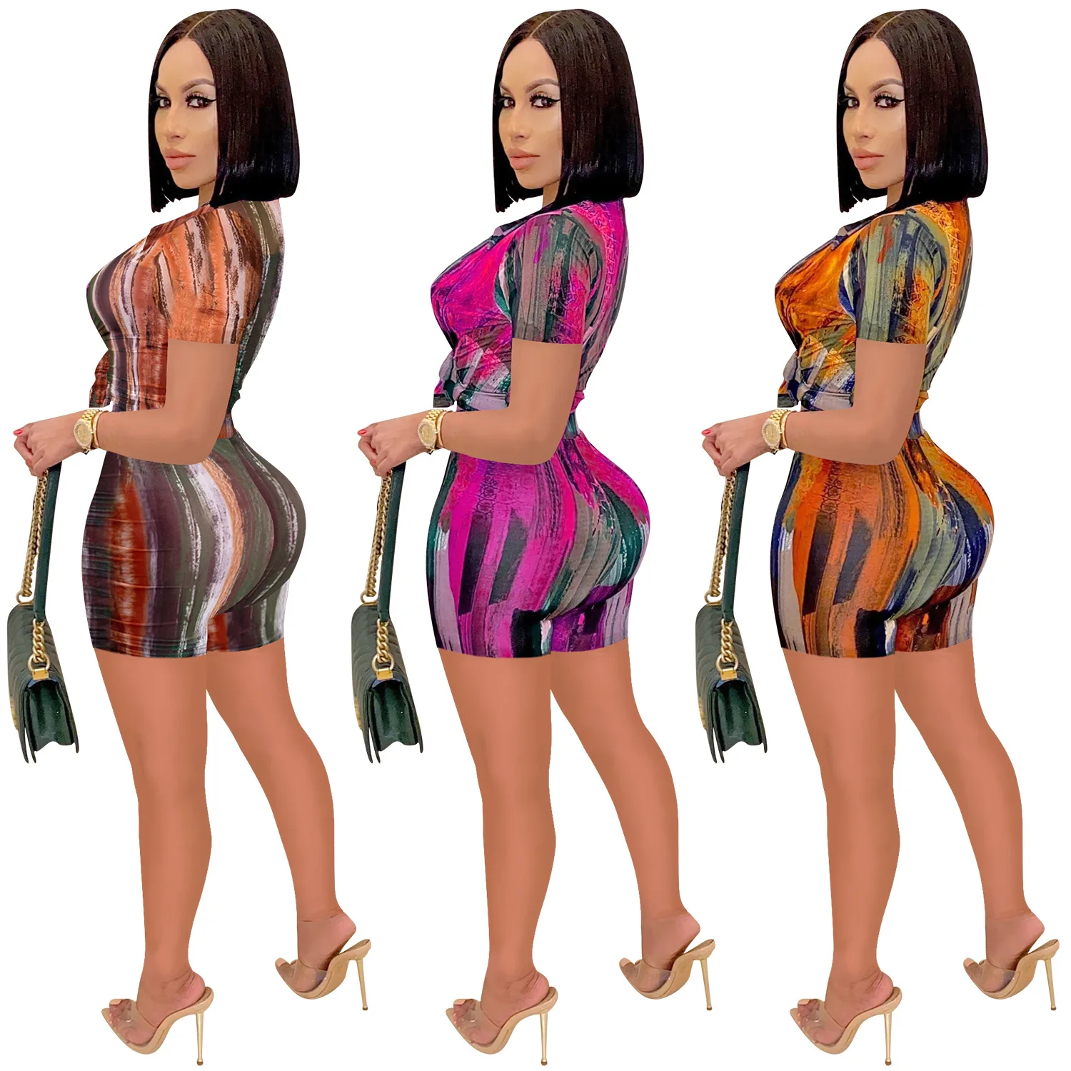 2025 Summer Women Outfit Spring Print V Neck Short Sleeve Crop Top Tight Shorts Suit Sexy Two Piece Set
