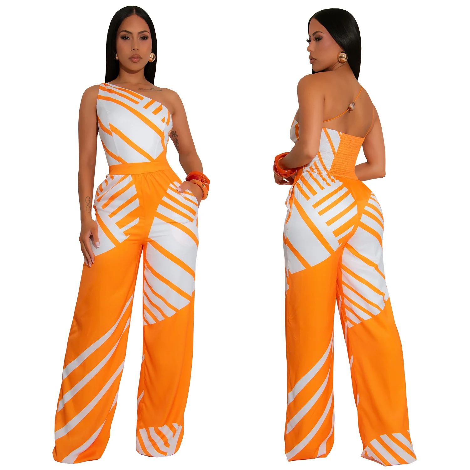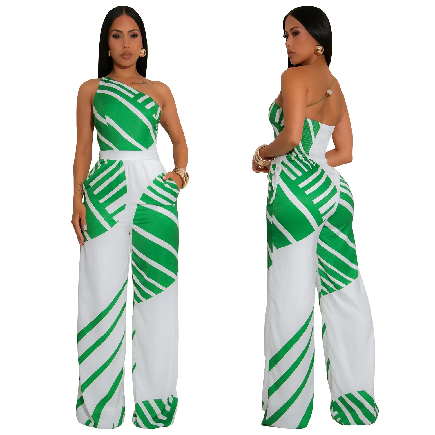 ZYHT 73963 Matte Satin Printed Geometric Pattern Maxi Women Asymmetric One Shoulder Ruched Hem Women Dress