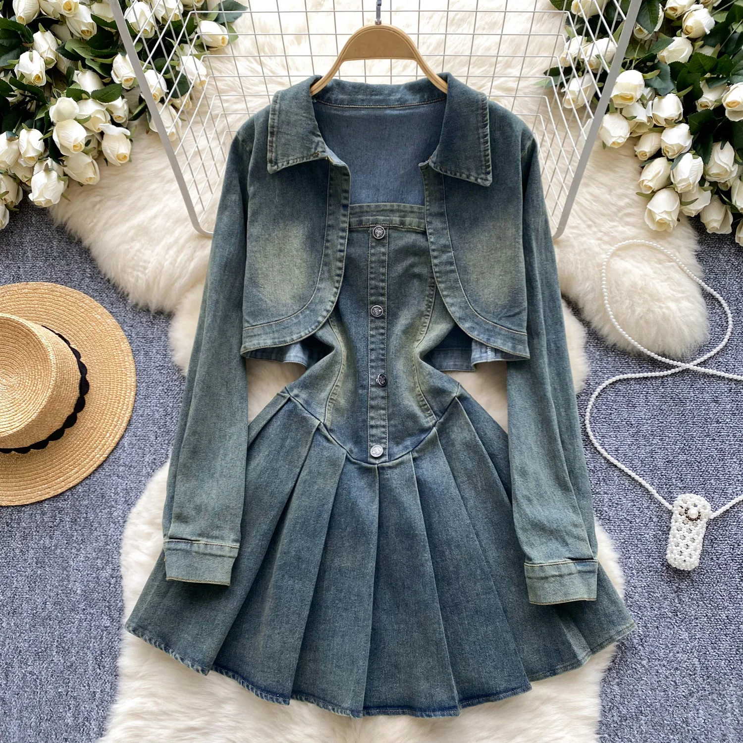 Jeans Style Waist Cinching Slimming Camisole Denim Dress Long Sleeves and Shawl, Two-piece Denim Set Women