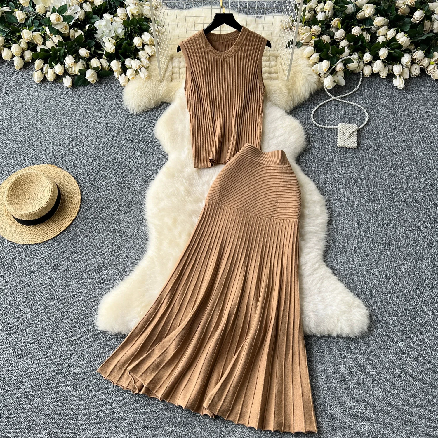Versatile Slim Fit Sleeveless Vertical Knit Top Two-piece Set for Women's High Waist Slimming Fish Tail Skirt