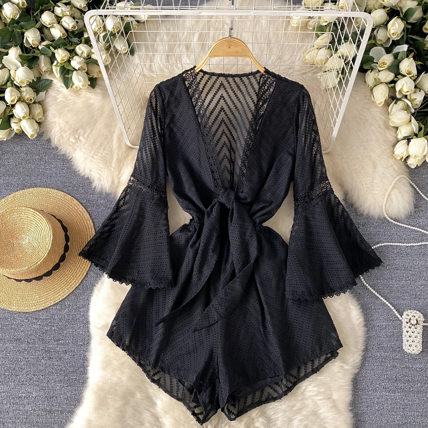 Summer Jumpsuit Women's Mesh Loose Flared Sleeve Jumpsuit Shorts