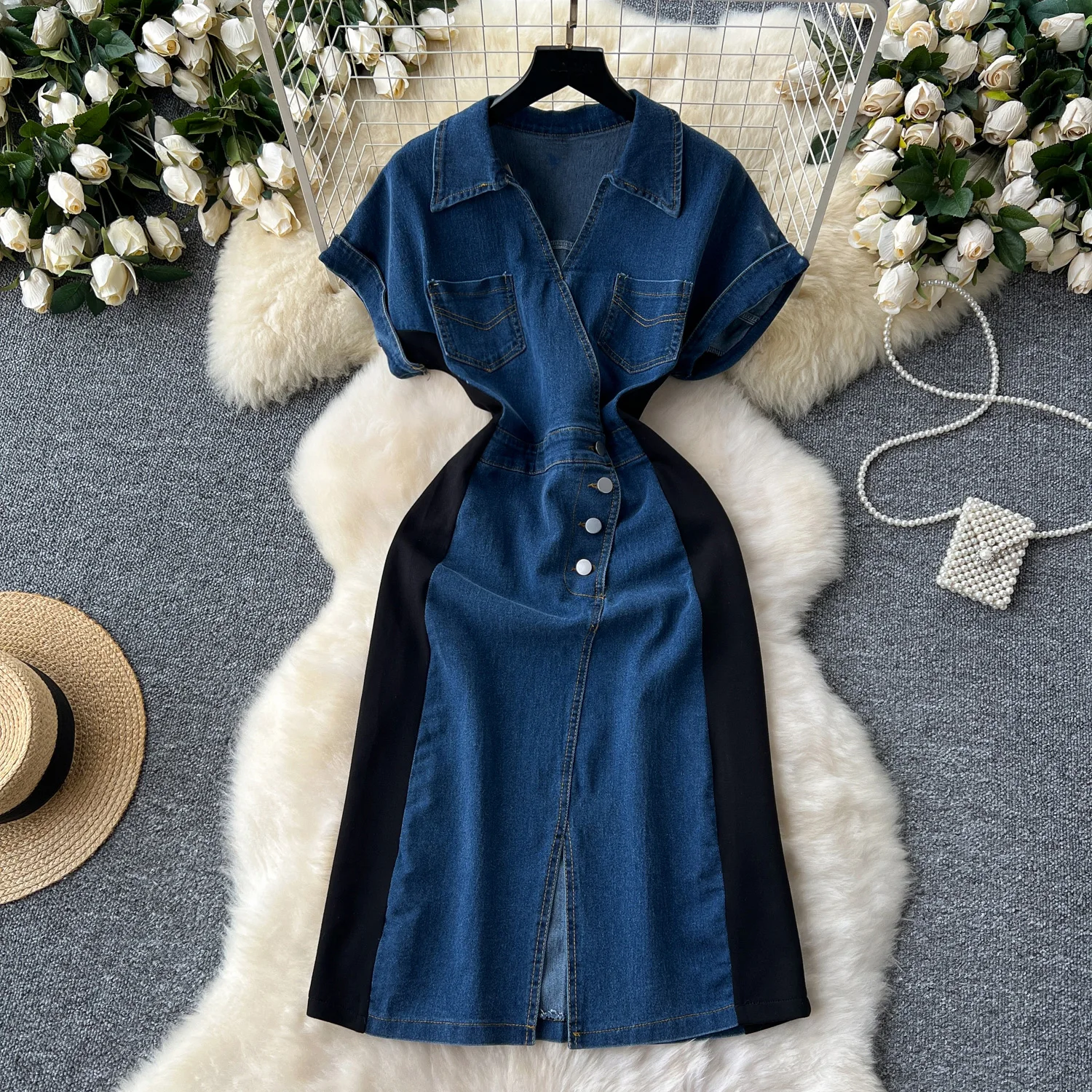 Customized Korean Fashion Polo Collar Short Sleeved Denim Patchwork Dress Waist Cinching and Slit Long Dress