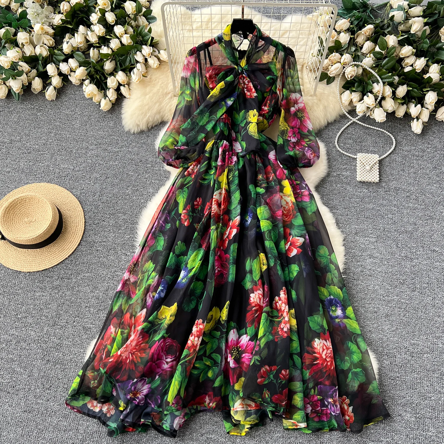 Customized Dress With Thin Printed butterfly Flower Chiffon Long Dress