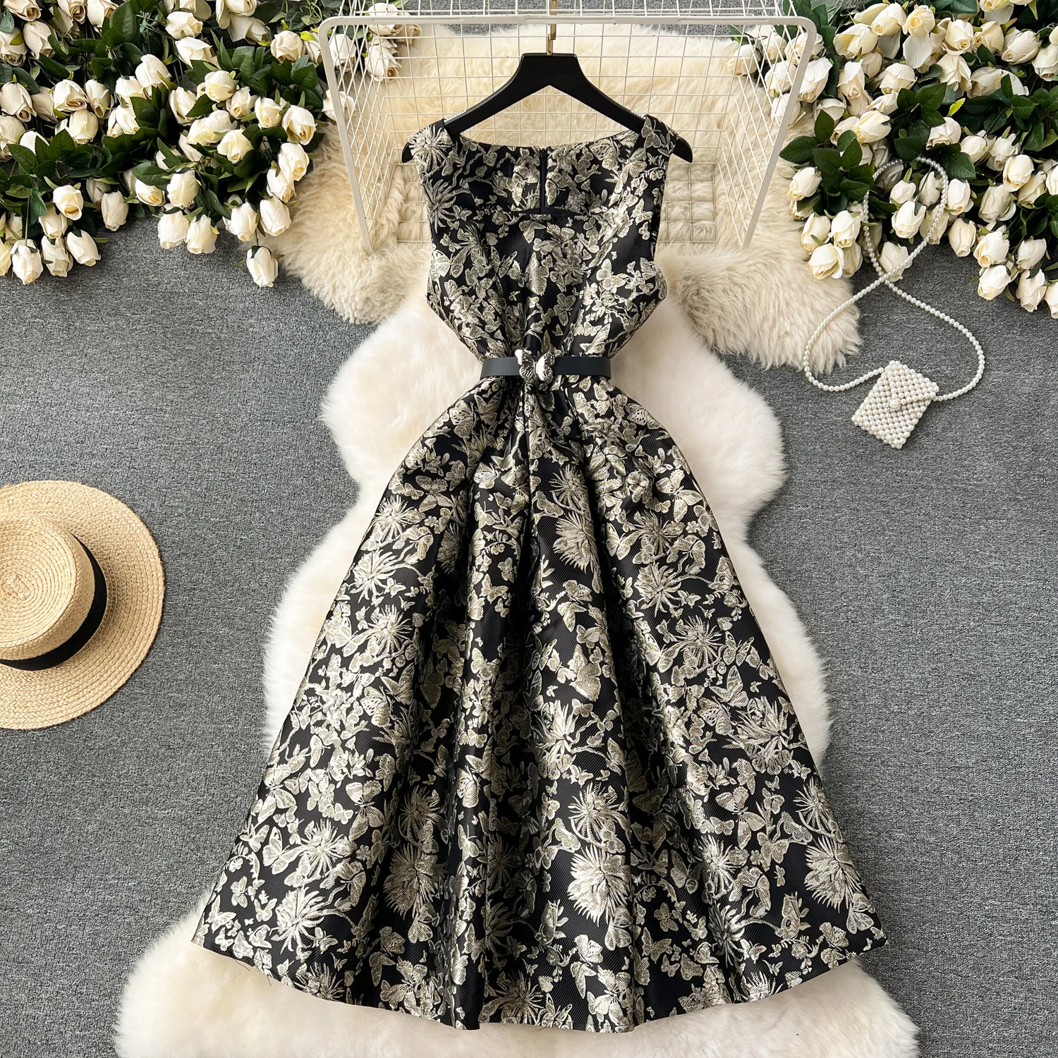 Customized Style Dress Jacquard Slim Fit Sleeveless Large Hem Midi Long Dress