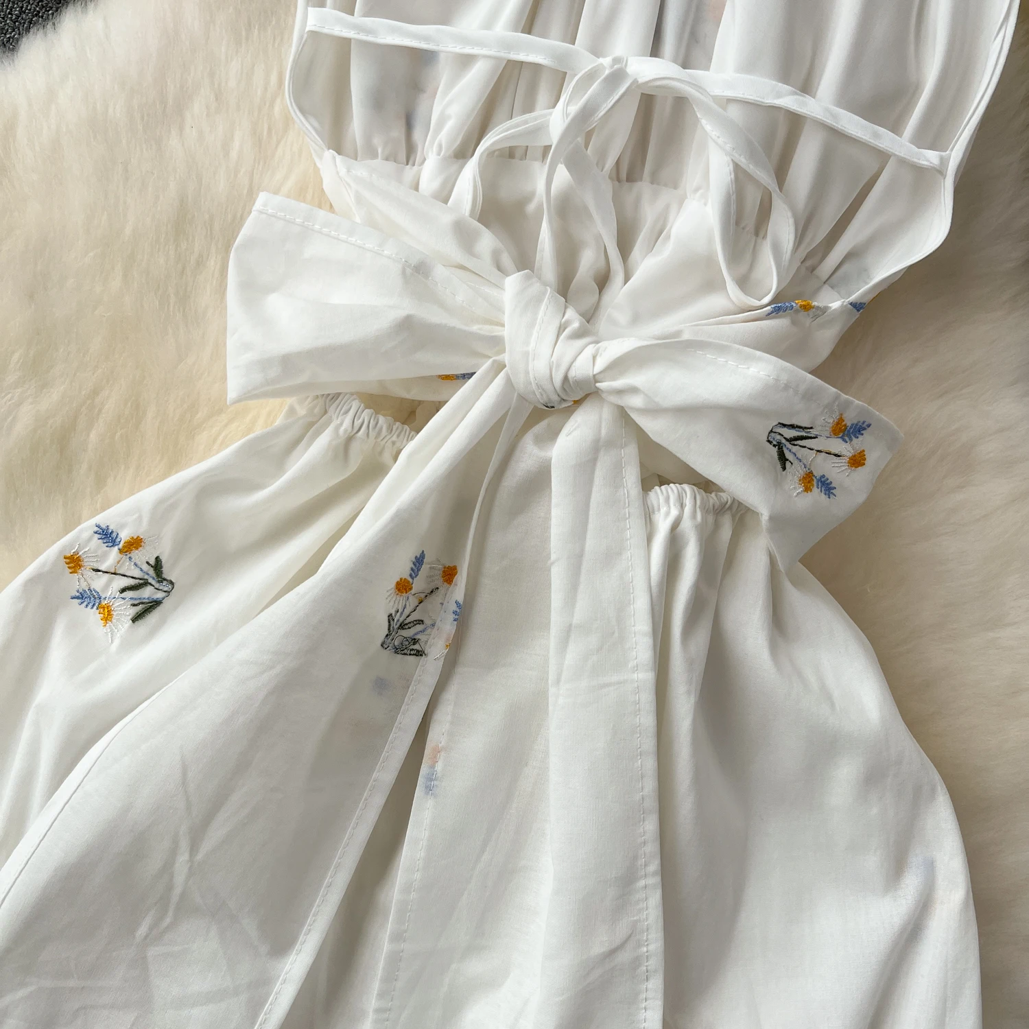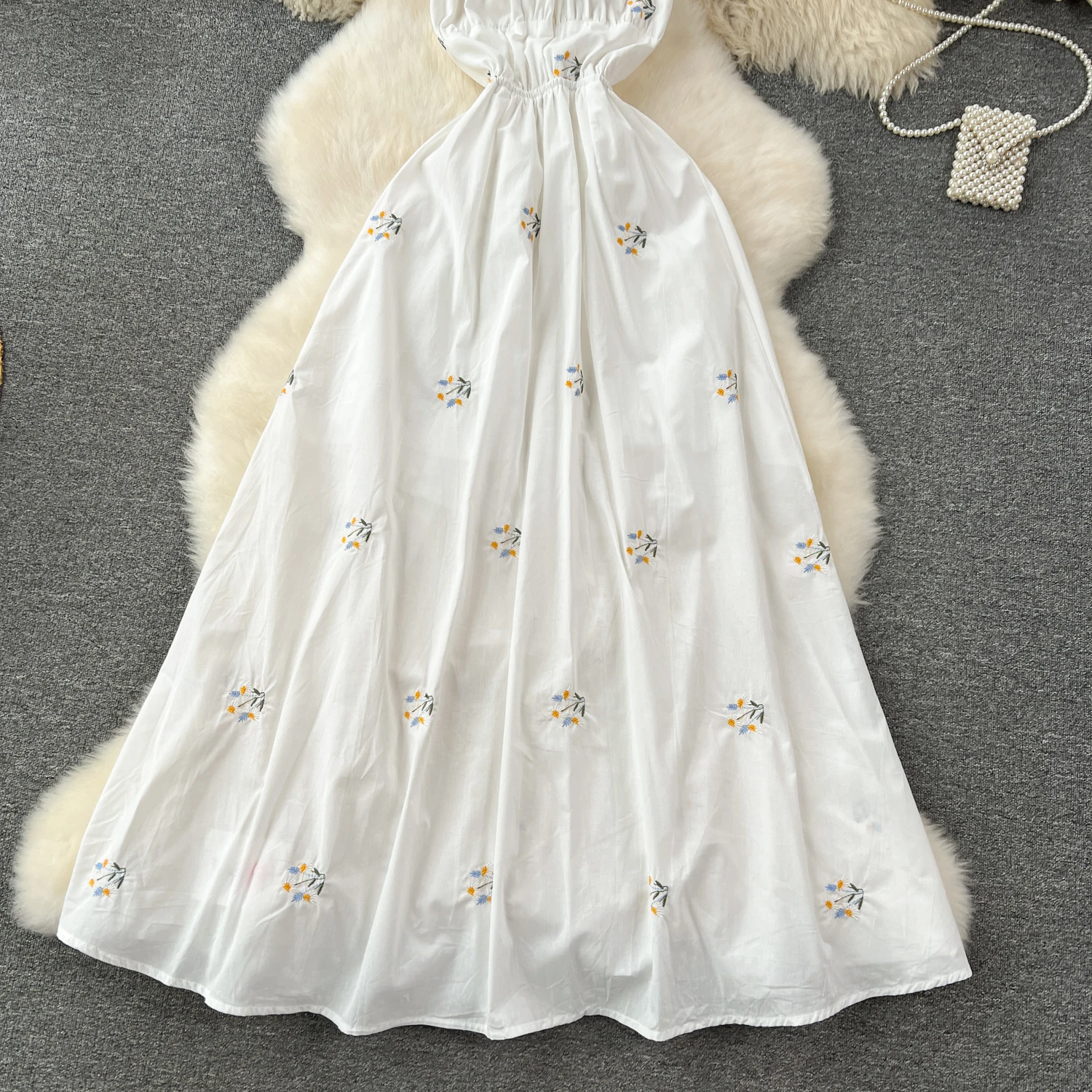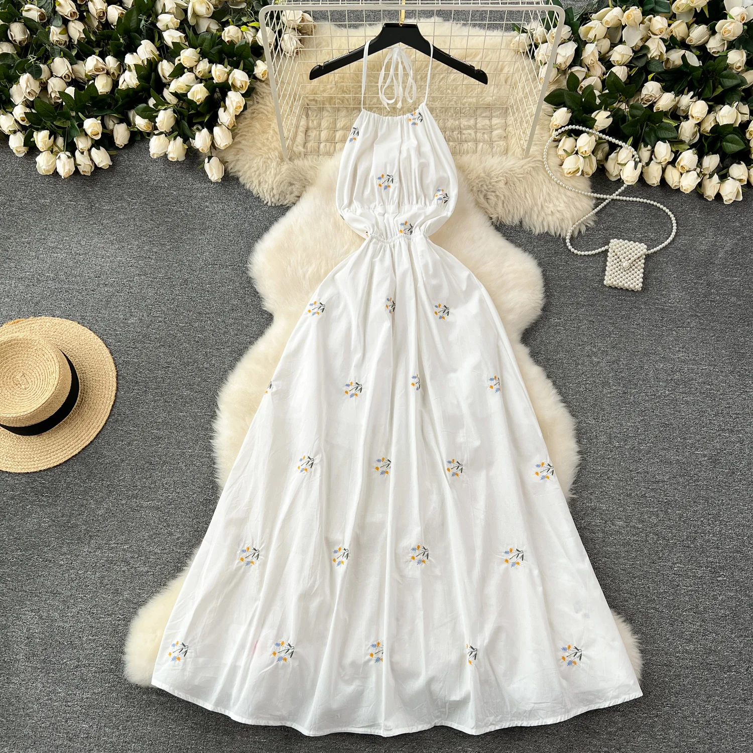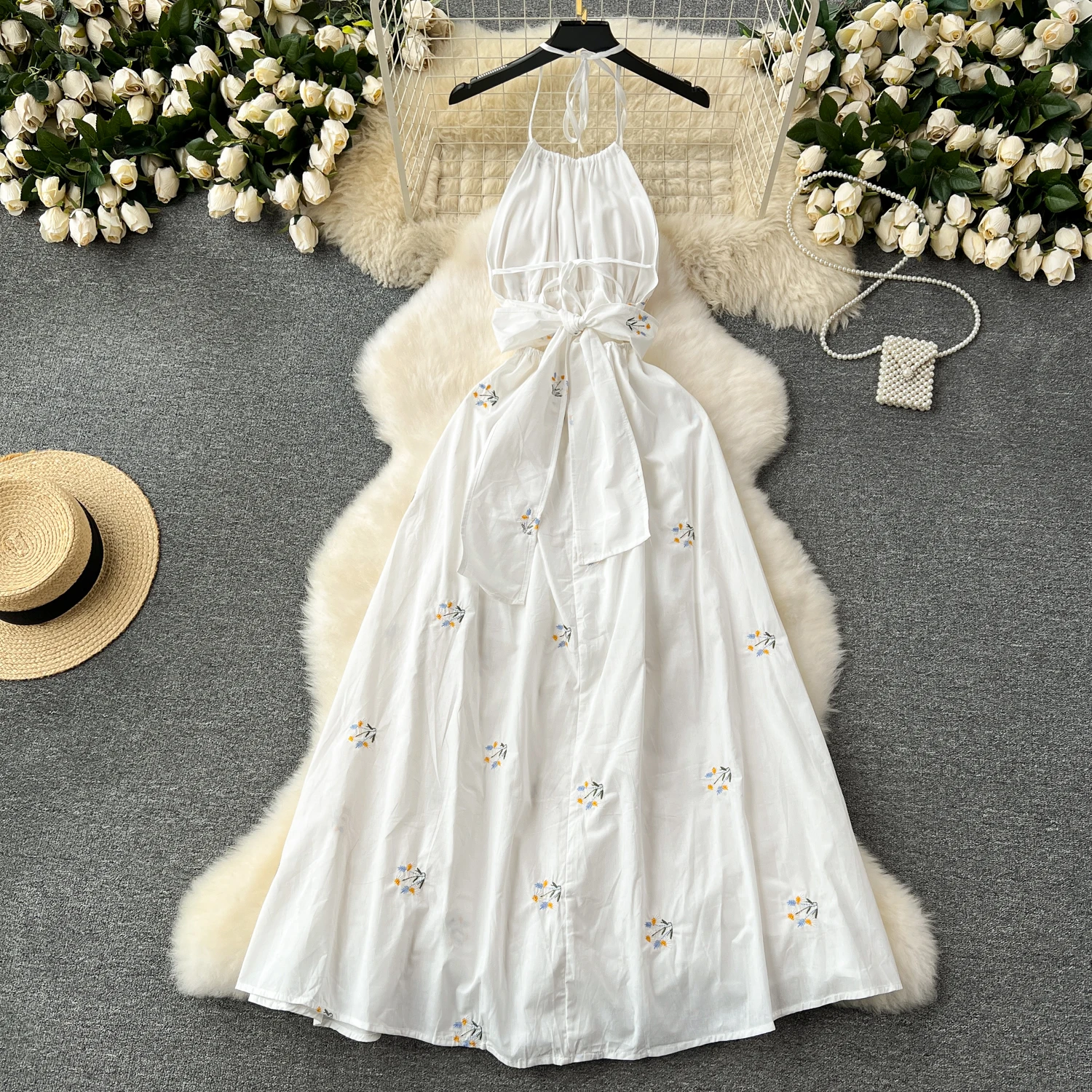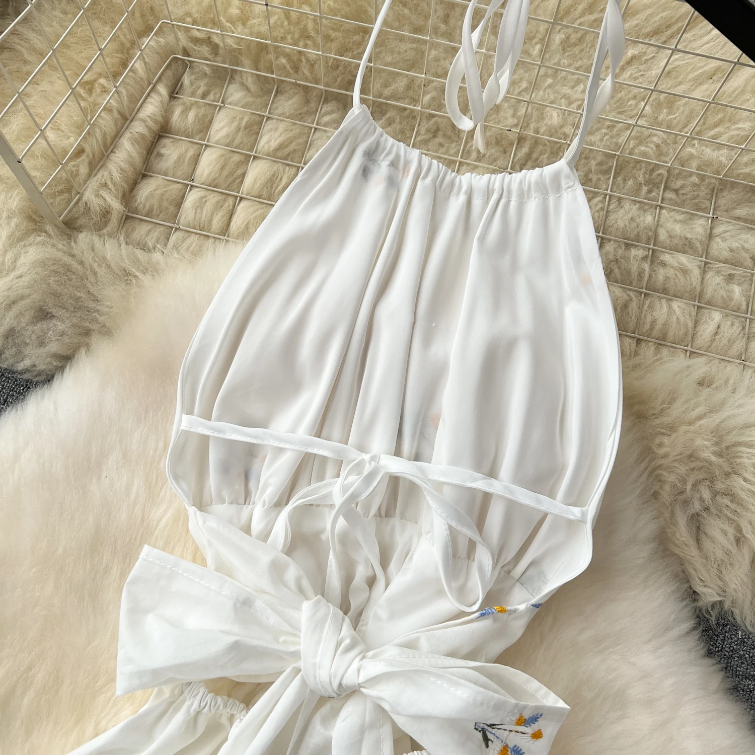 Customized Sexy Hollowed Out Backless Dress Women Embroidered Flower Vacation White Dress