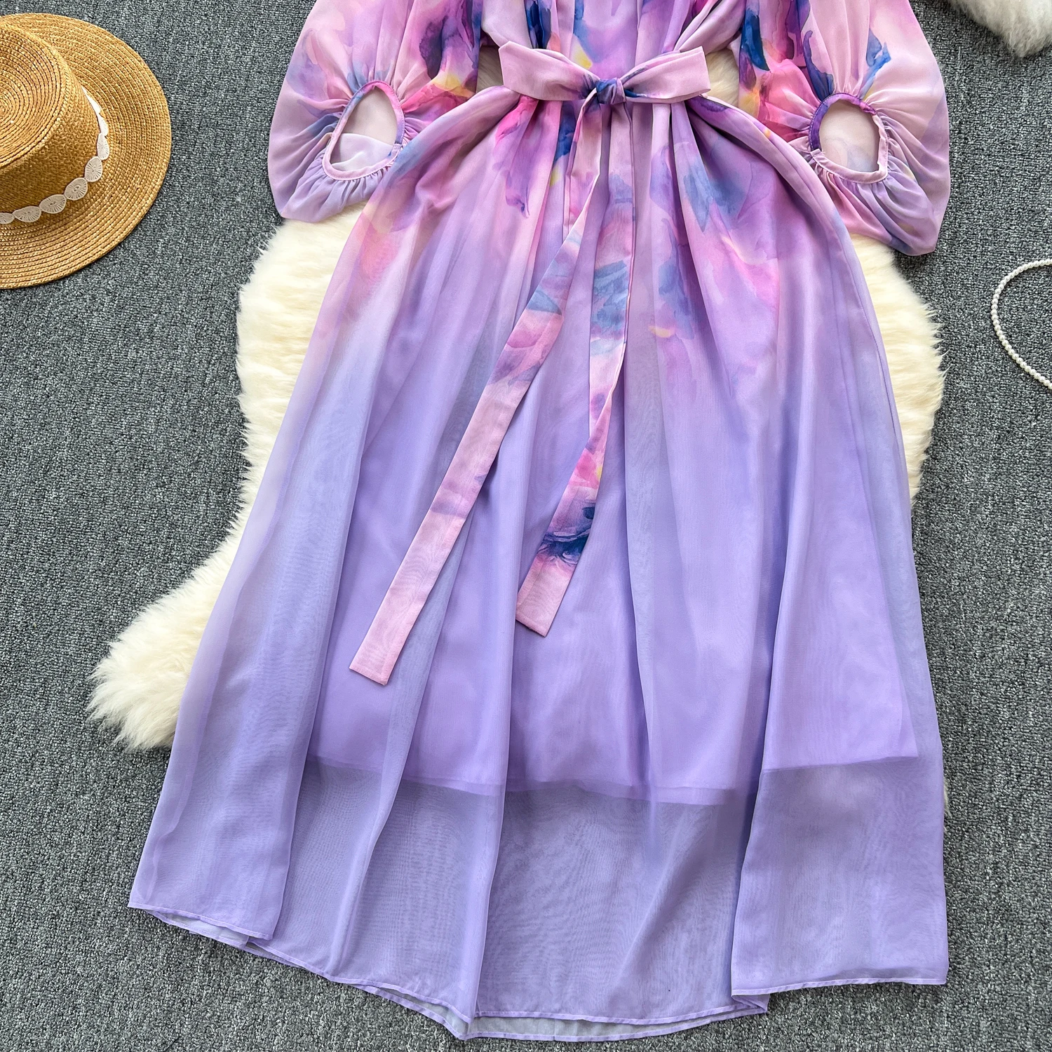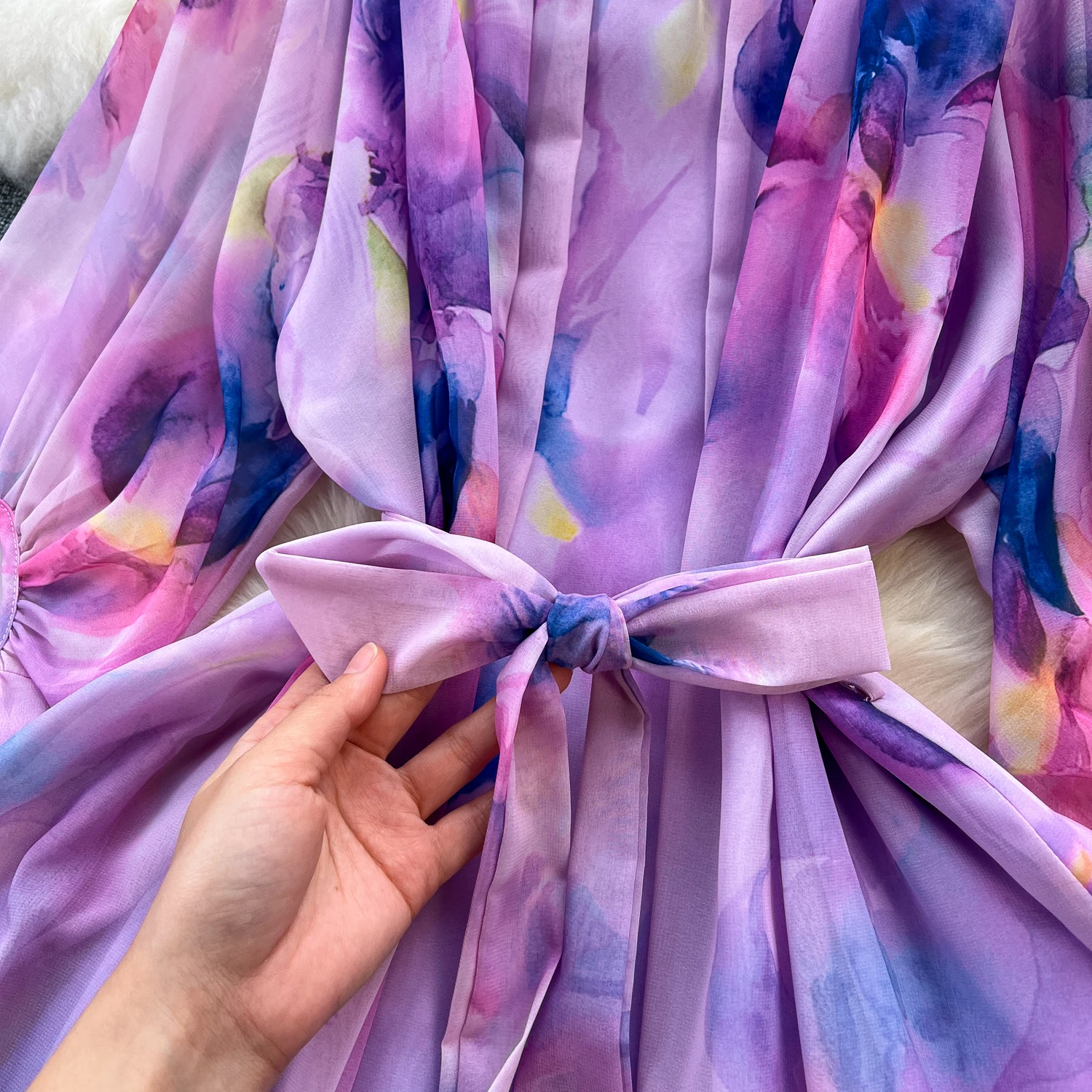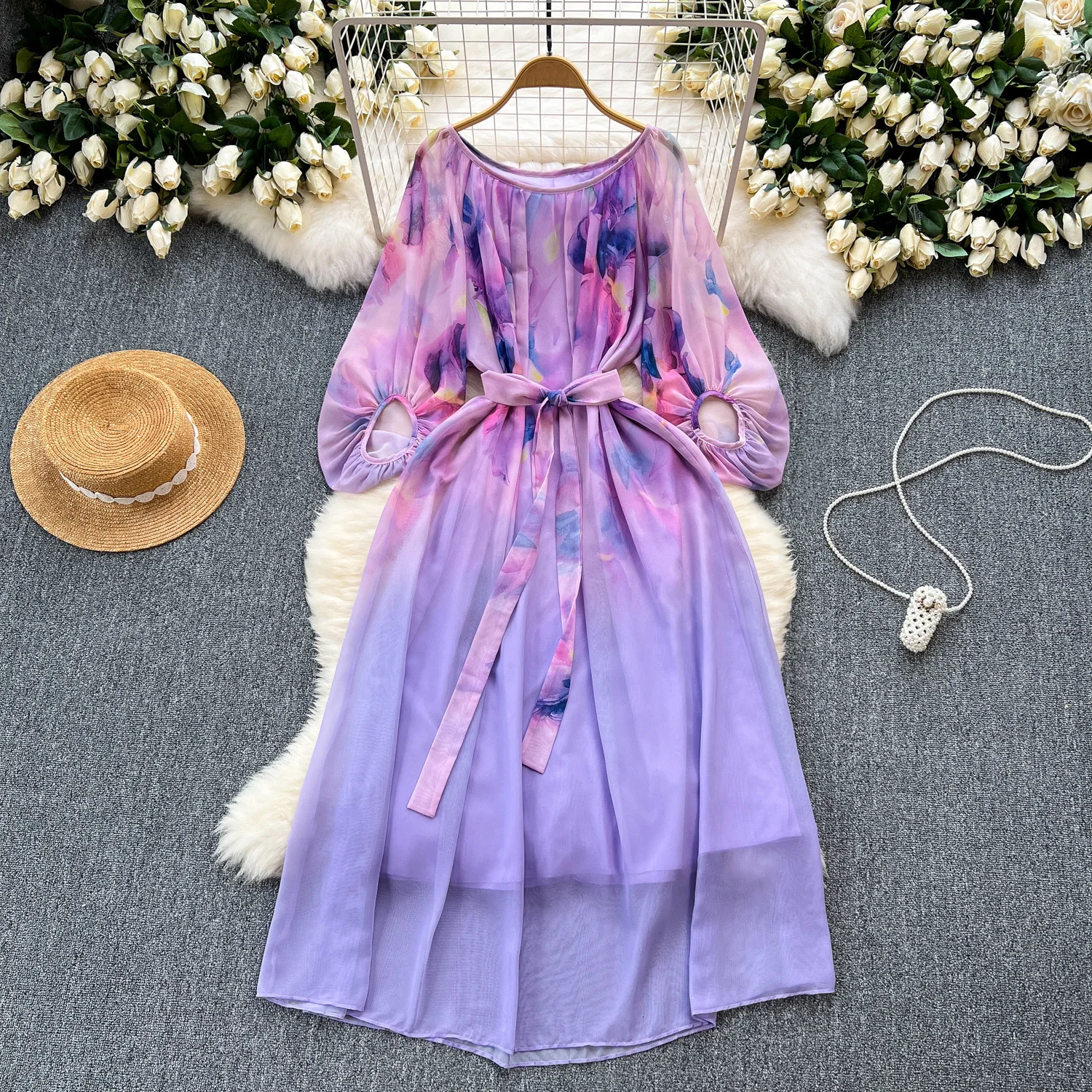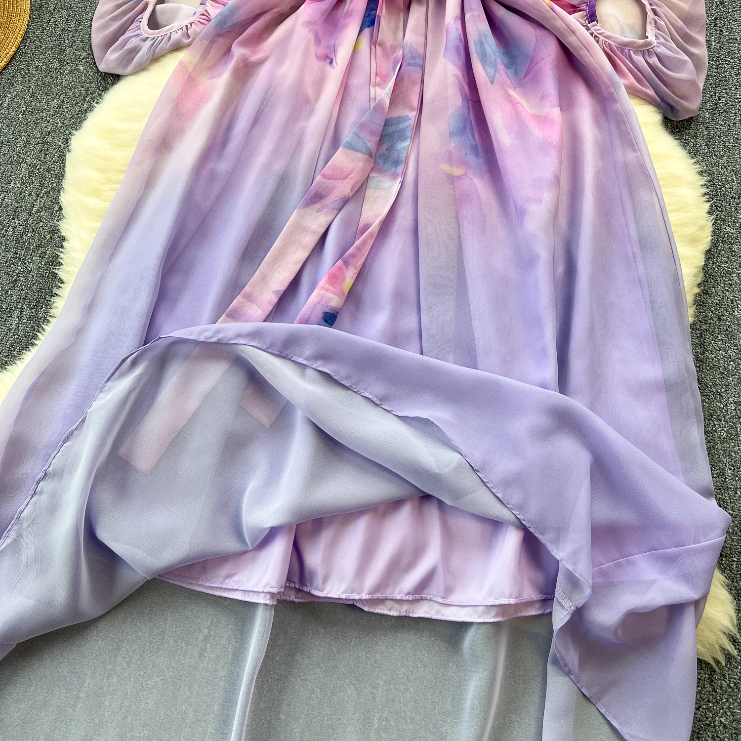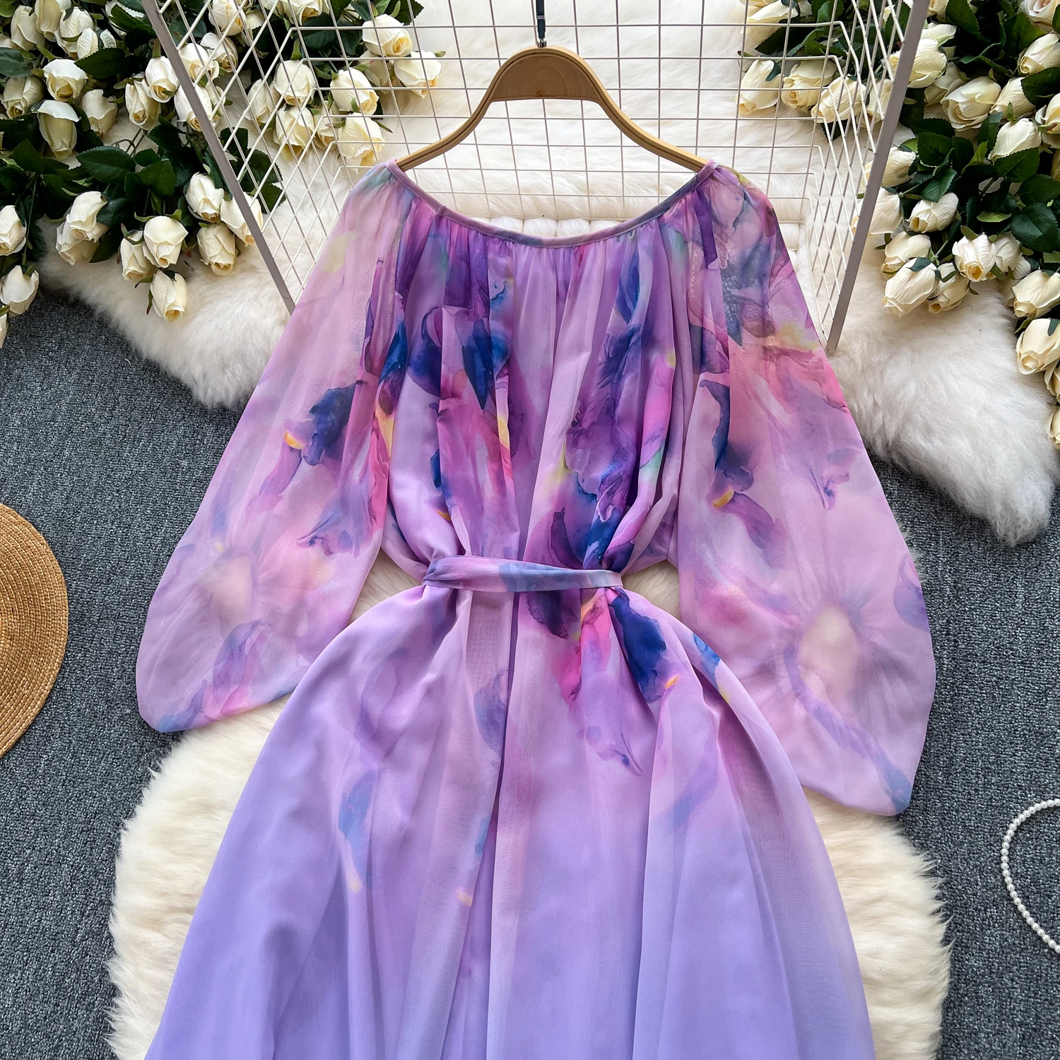 Customized Dress Women 2024 New Loose Lantern Sleeves Printed Chiffon Purple Dress