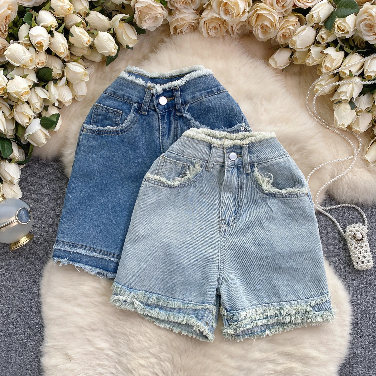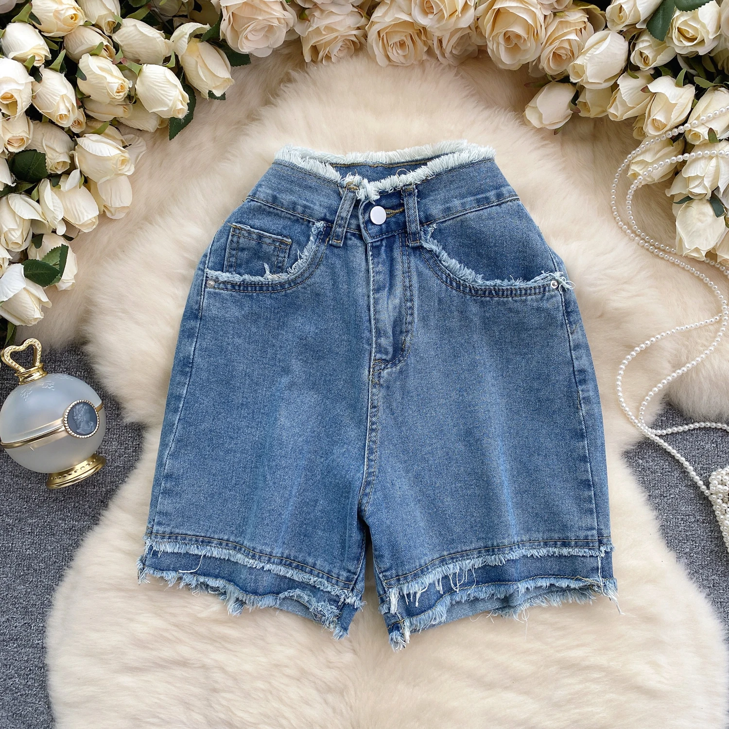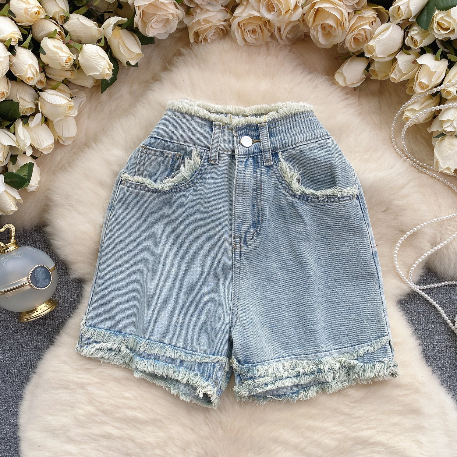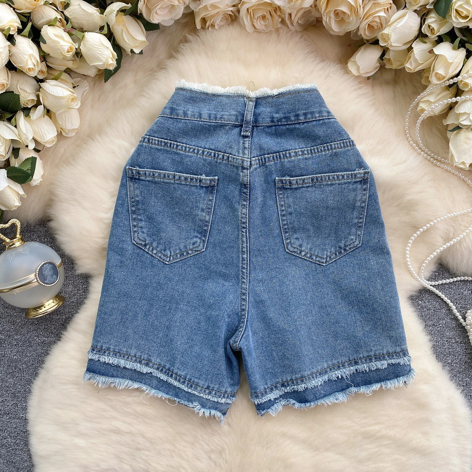 Customized Women's Denim Shorts Women's Ruffled High Waisted Wide Leg Lady Jeans Short