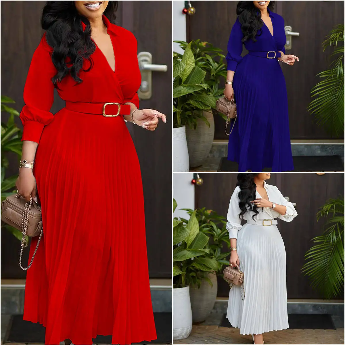 2025 Trendy Spring Women Office Dress Long Sleeve V Neck Pleated with Belt Solid Natural Woven Elegant Casual OEM