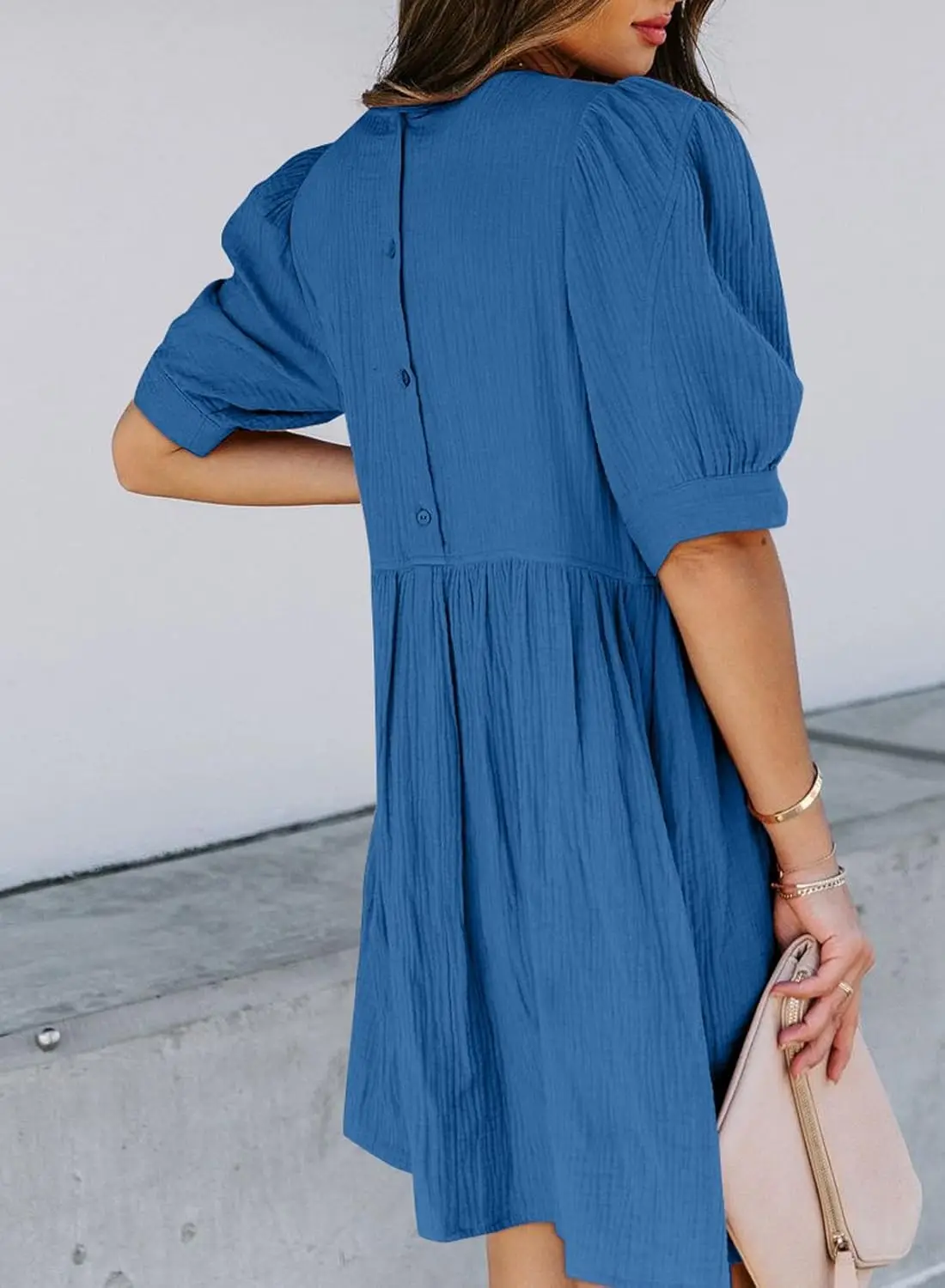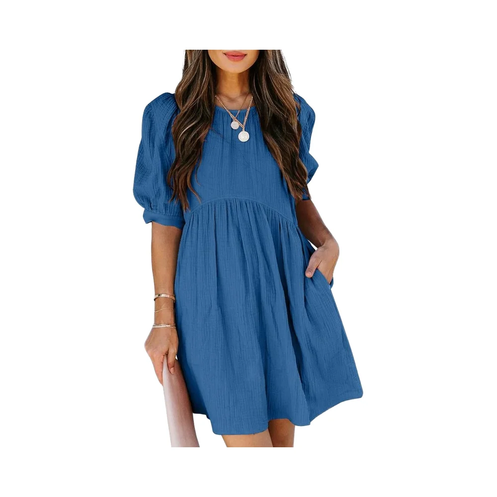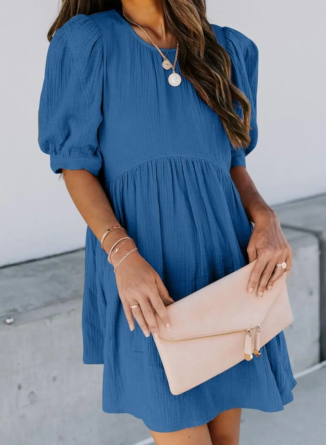 Womens Summer Elegant Empire Waist Mini Swing Skater Dresses Crewneck Puff Sleeve Babydoll Casual Natural Plain Dyed