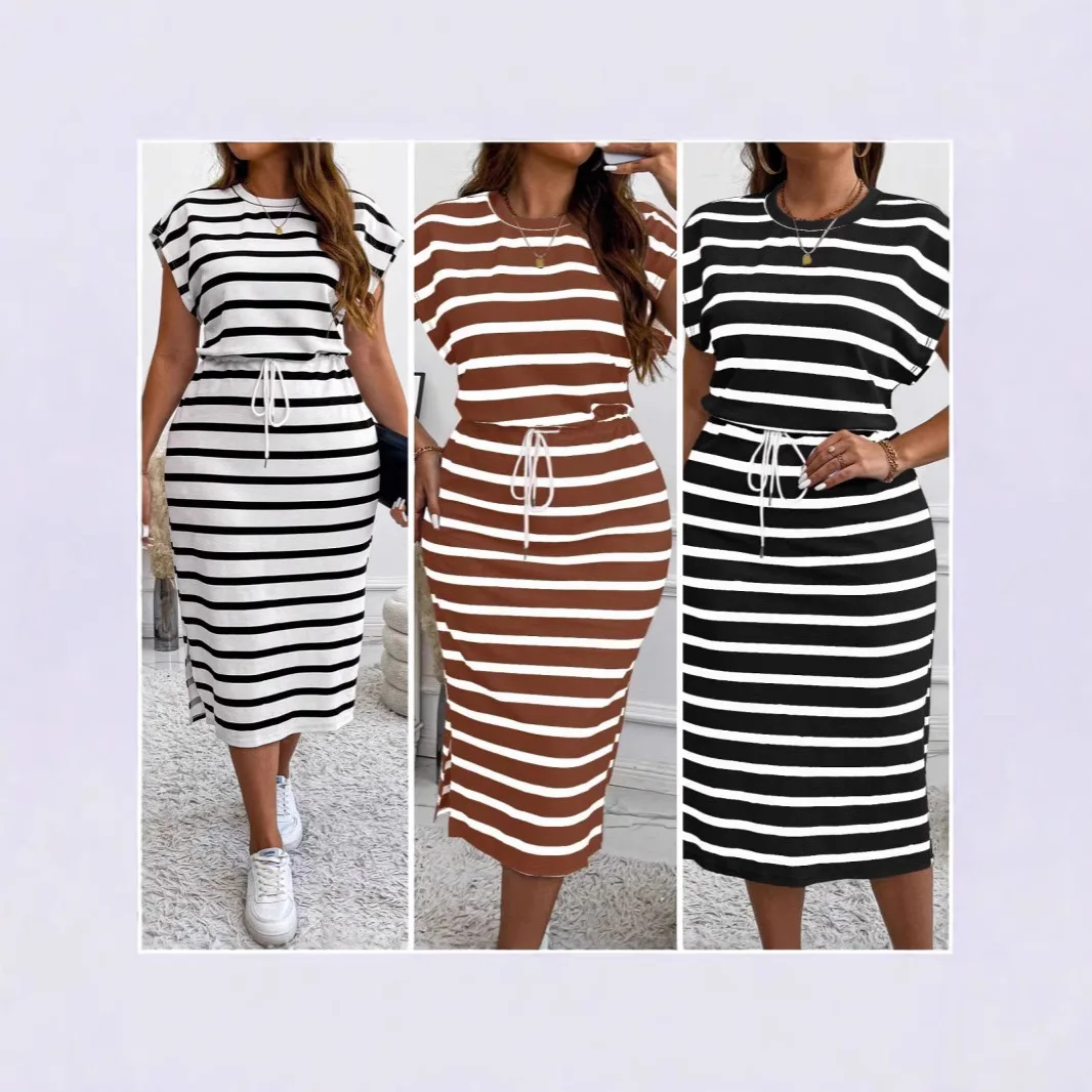 2025 European American Summer Casual Dresses Women Round Neck Stripe Printed Short Sleeve Large Size Dress