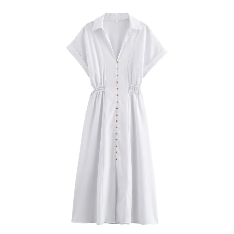 Women's Casual Summer Long Shirt Dress White Short Sleeve with Turn Down Collar Elastic Waist Buttons Maxi Length Solid Pattern