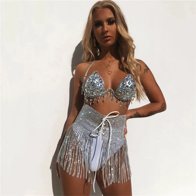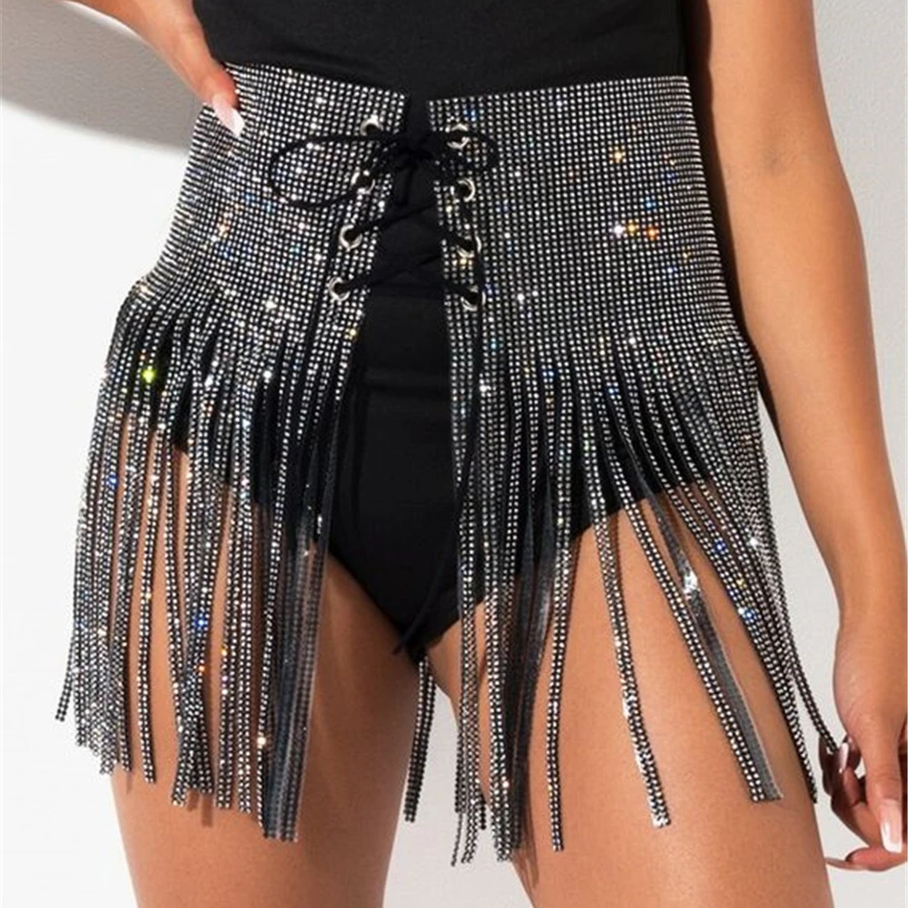Women's High Waist A-Line Skirt with Sequin Tassel Metal Wrap Festival Party Club Beach Bikini Skirt with Fringe for Club Beach