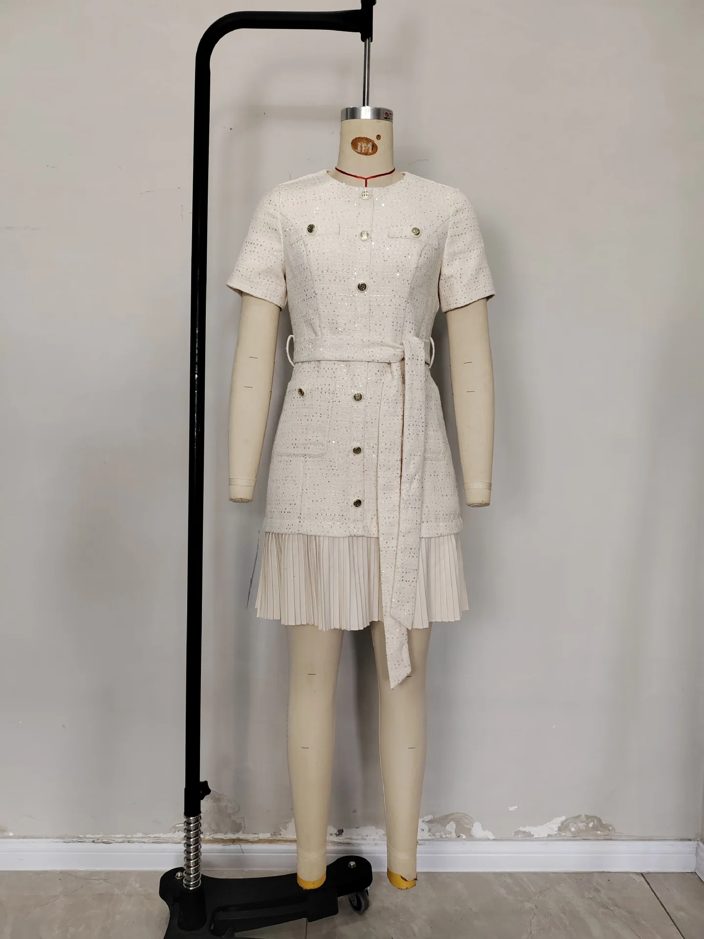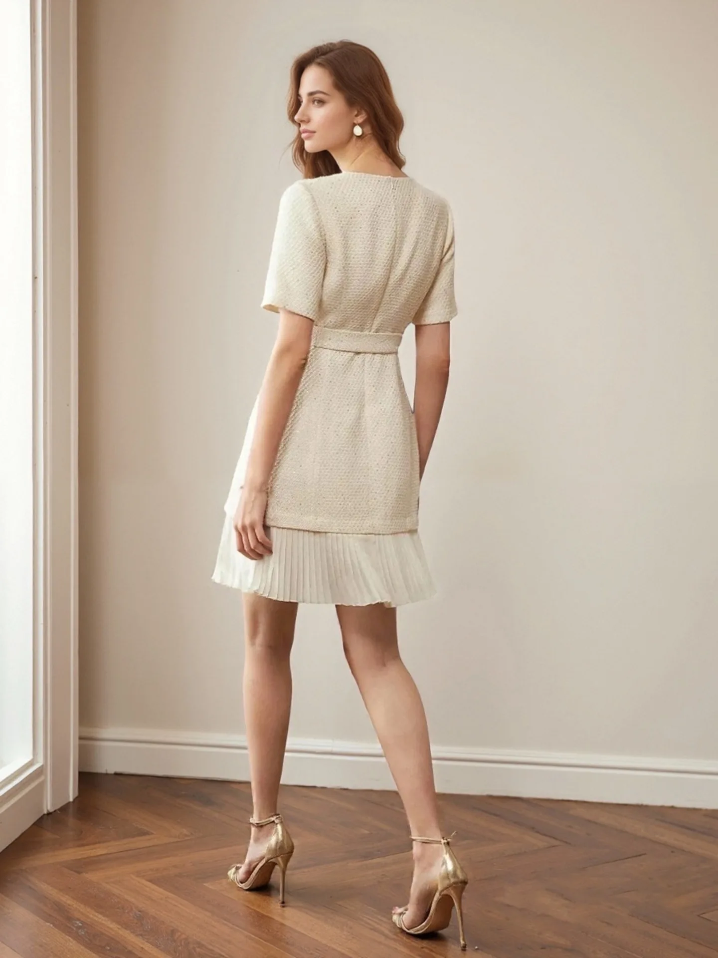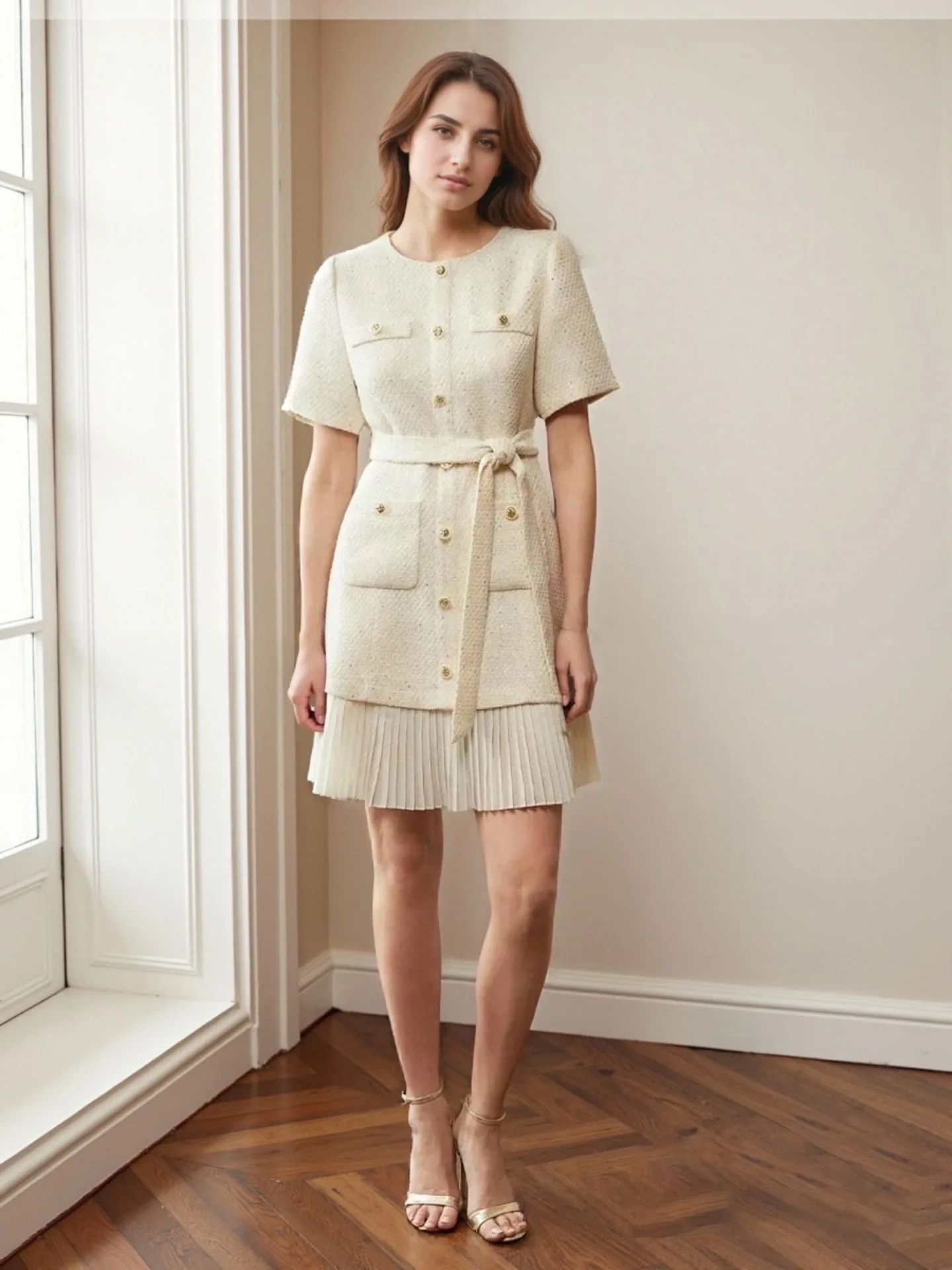Pleated Skirt European American Apricot French Vintage Crew Neck Solid Color Empire Waist Short Sleeve Dress Stand Alone Summer