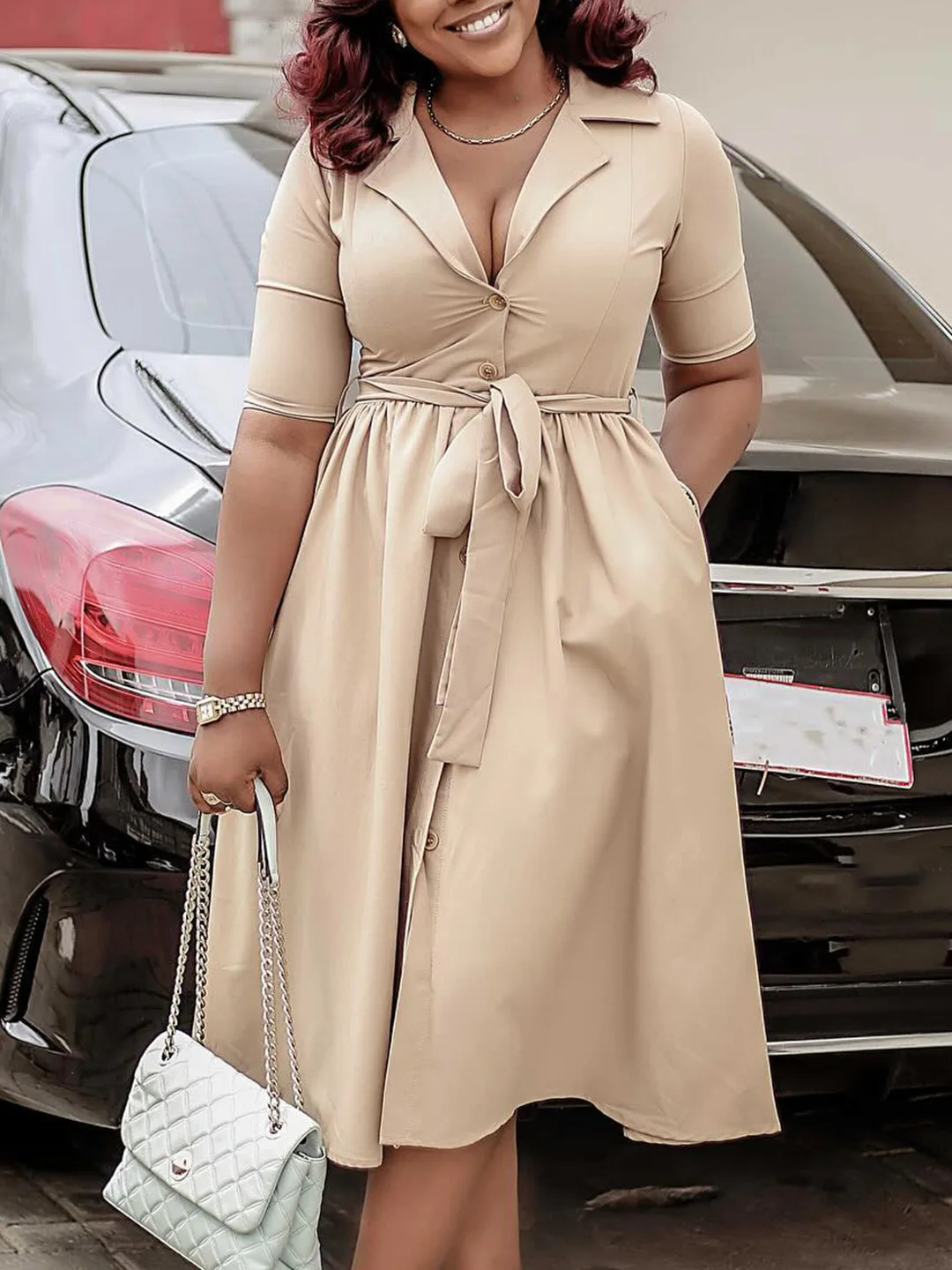 Women's 2026 Summer Vintage Fashion Dress Notched Collar Short-sleeved Solid Color High Waist Polyester Spandex