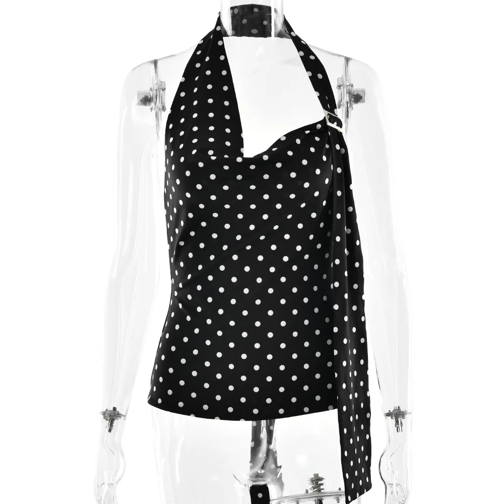 Summer Polka Dot V-neck Halter Top, Sexy and Retro Cinched Waist Halter Top