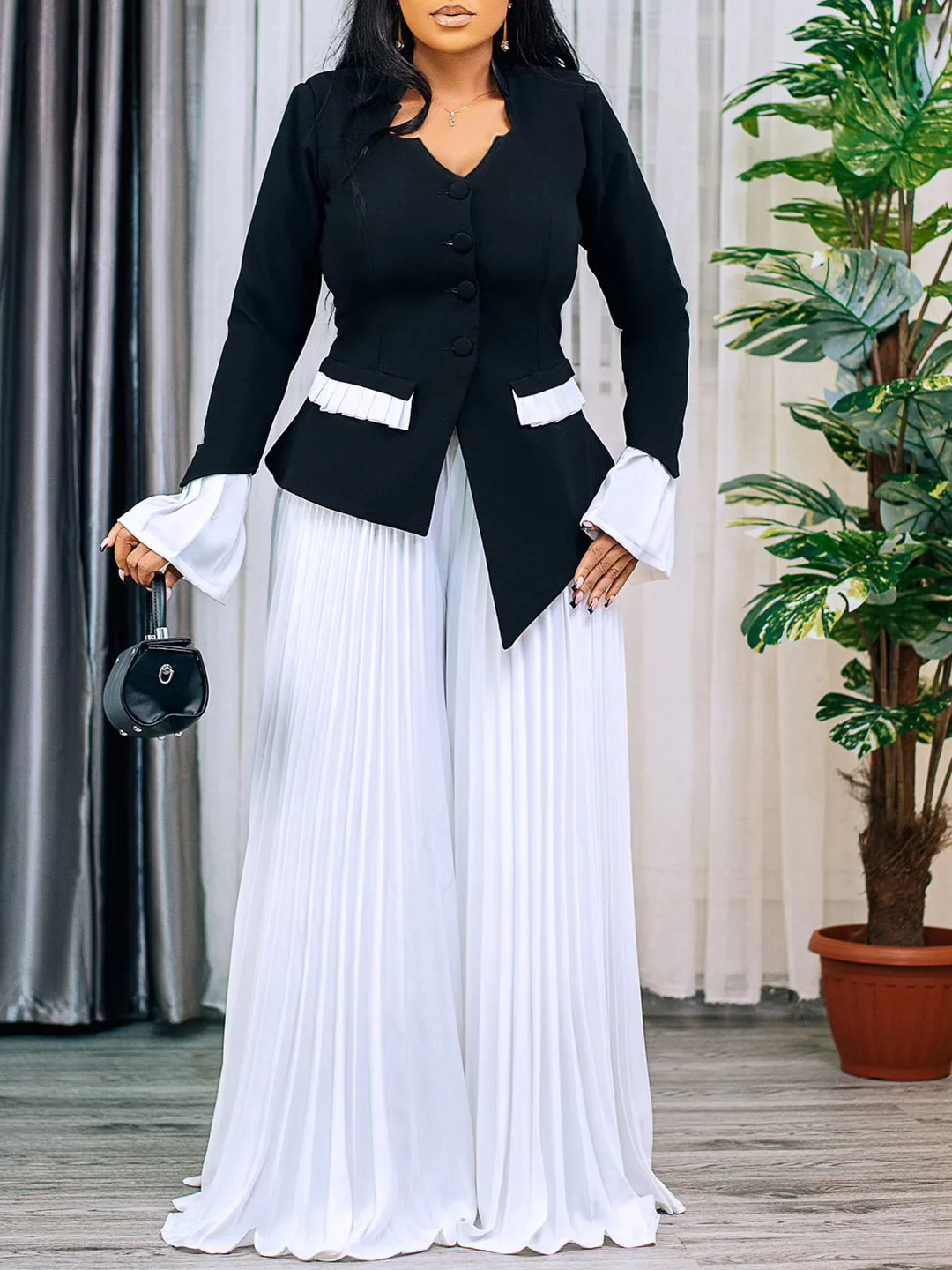 Women's 2026 Spring New Fashion Solid Bow Bell Sleeve Top Pleated Wide Leg Pants Two-piece Set