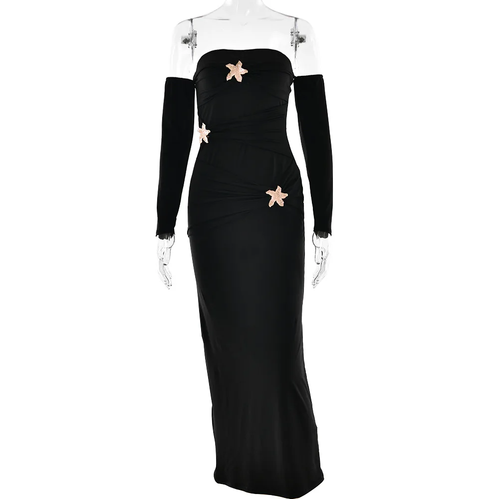 ZYHT 73903 Gemstone Crystal 3D Flower Decoration Ruched One Shoulder High Slit Long Sleeve Maxi Simple Elegant Evening Dress
