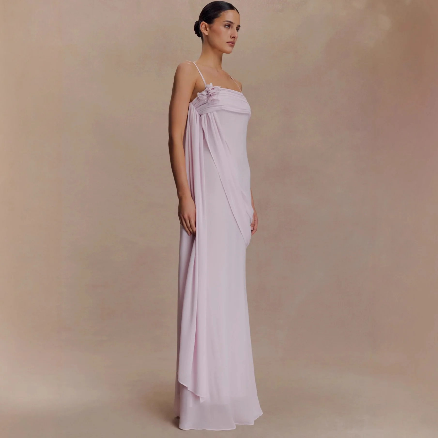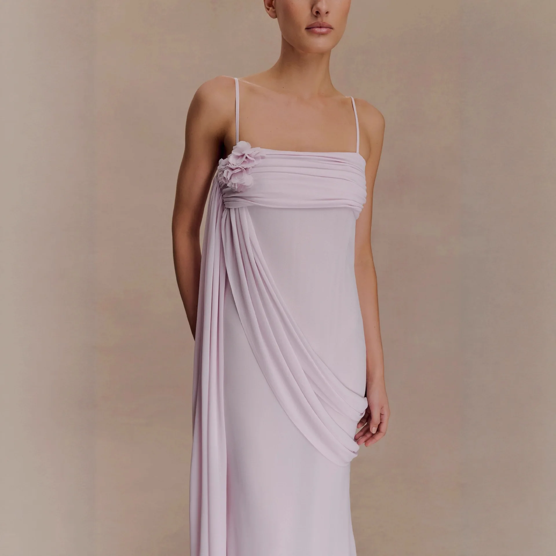 ZYHT 73903 Gemstone Crystal 3D Flower Decoration Ruched One Shoulder High Slit Long Sleeve Maxi Simple Elegant Evening Dress