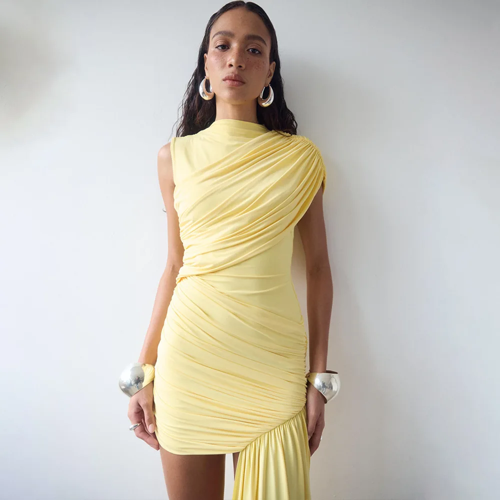 Summer's New Slim-fitting Ribbon Dress, a Round-neck, Pleated, Hip-hugging, Irregular Sleeveless Dress