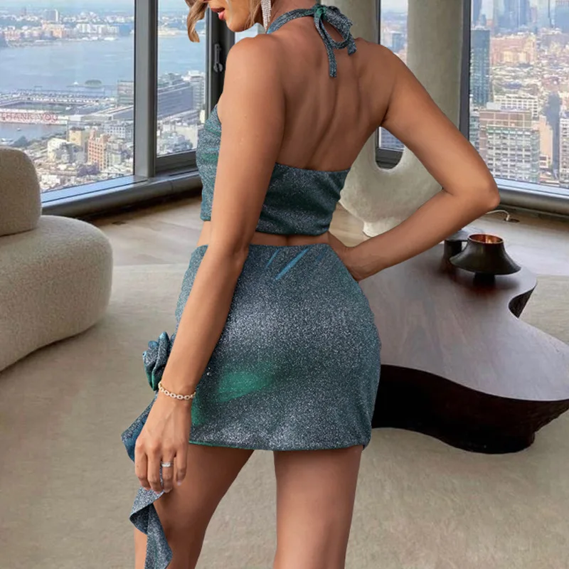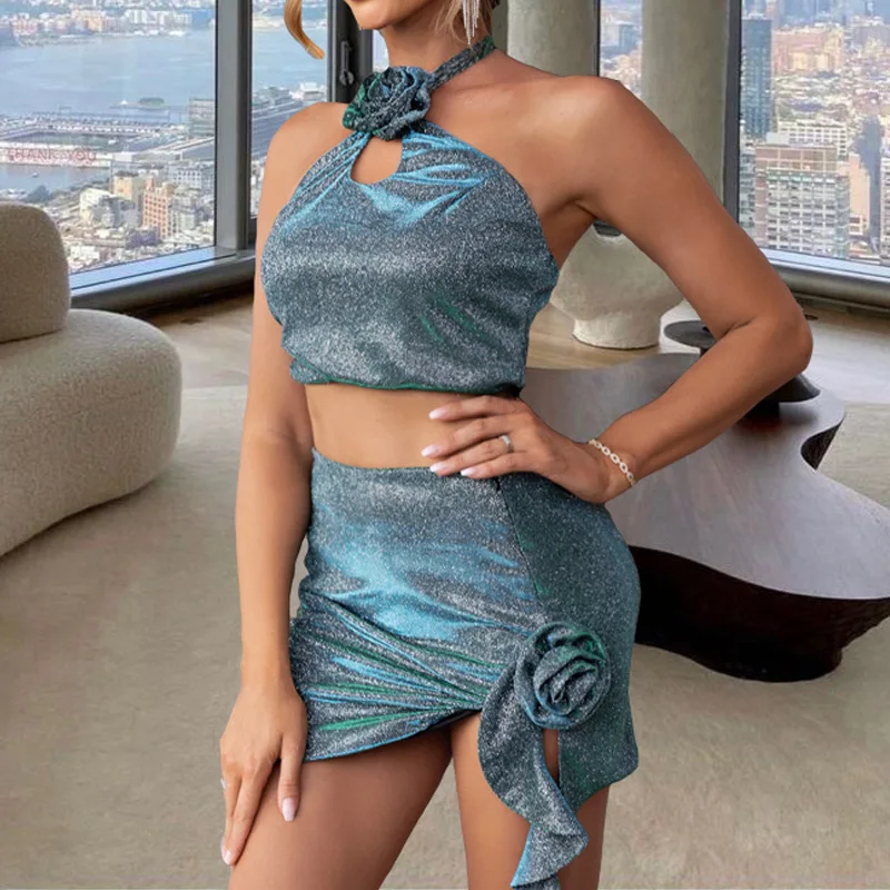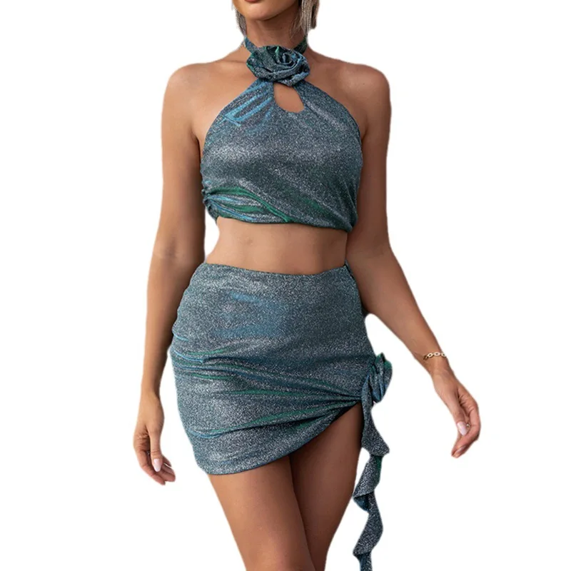 Sexy Spice Girl Halter Top Set Women's Summer Three-dimensional Flower Hanging Neck High Waist Hip Skirt Two-piece Set