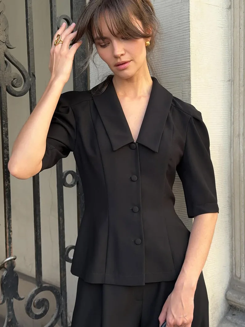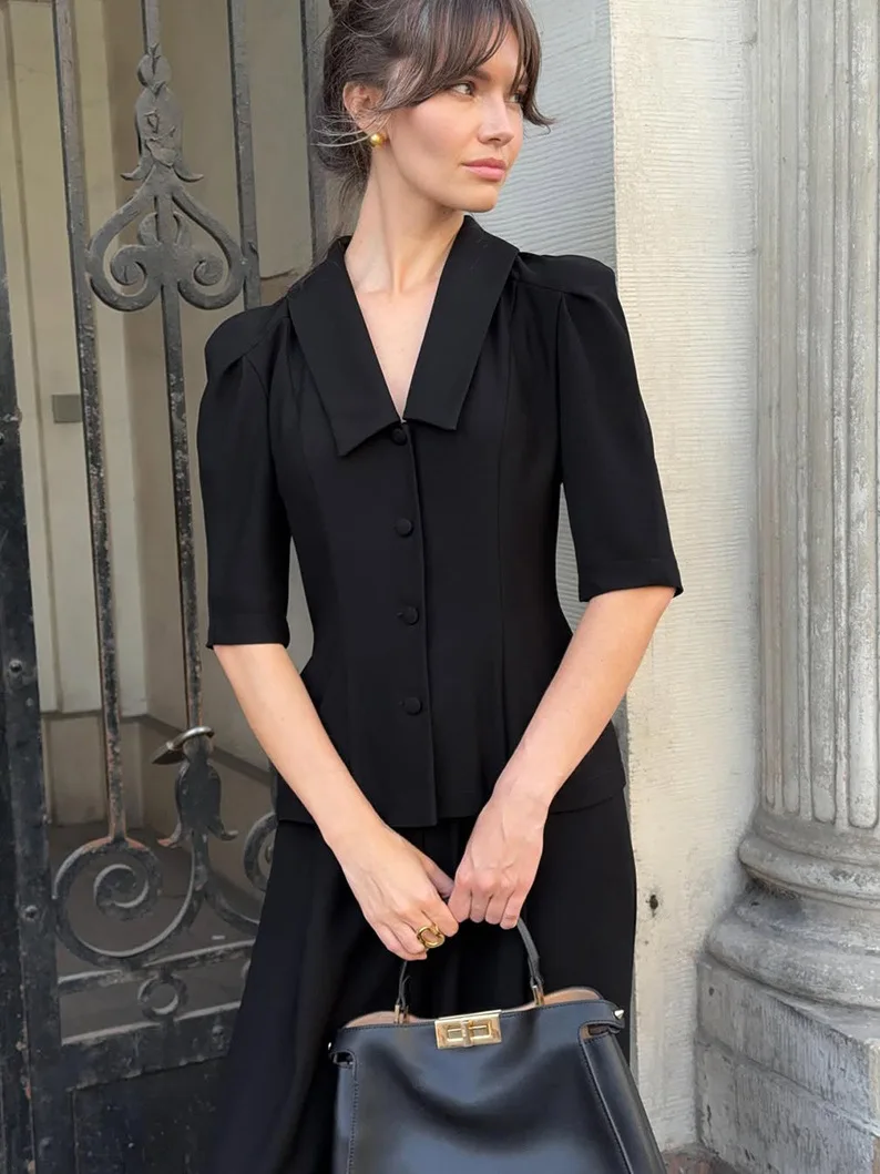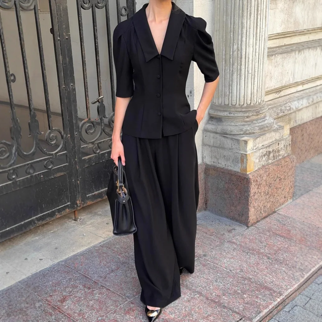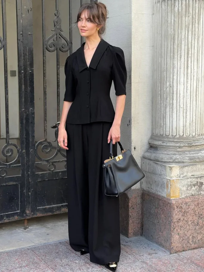 French Niche Design Sense Black V-Neck Button Half Sleeve Tight Waist Velour Anti-Wrinkle Top Trousers Two-Piece Set Women's