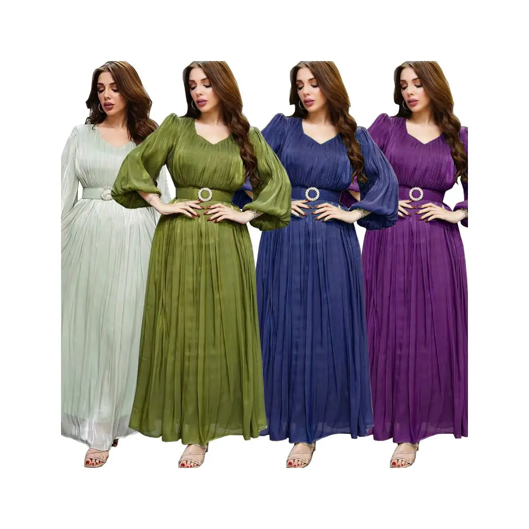 High Quality Abaya Maxi Muslim Women Evening Dress Shiny Silk Satin Modest Party Dress With Belt