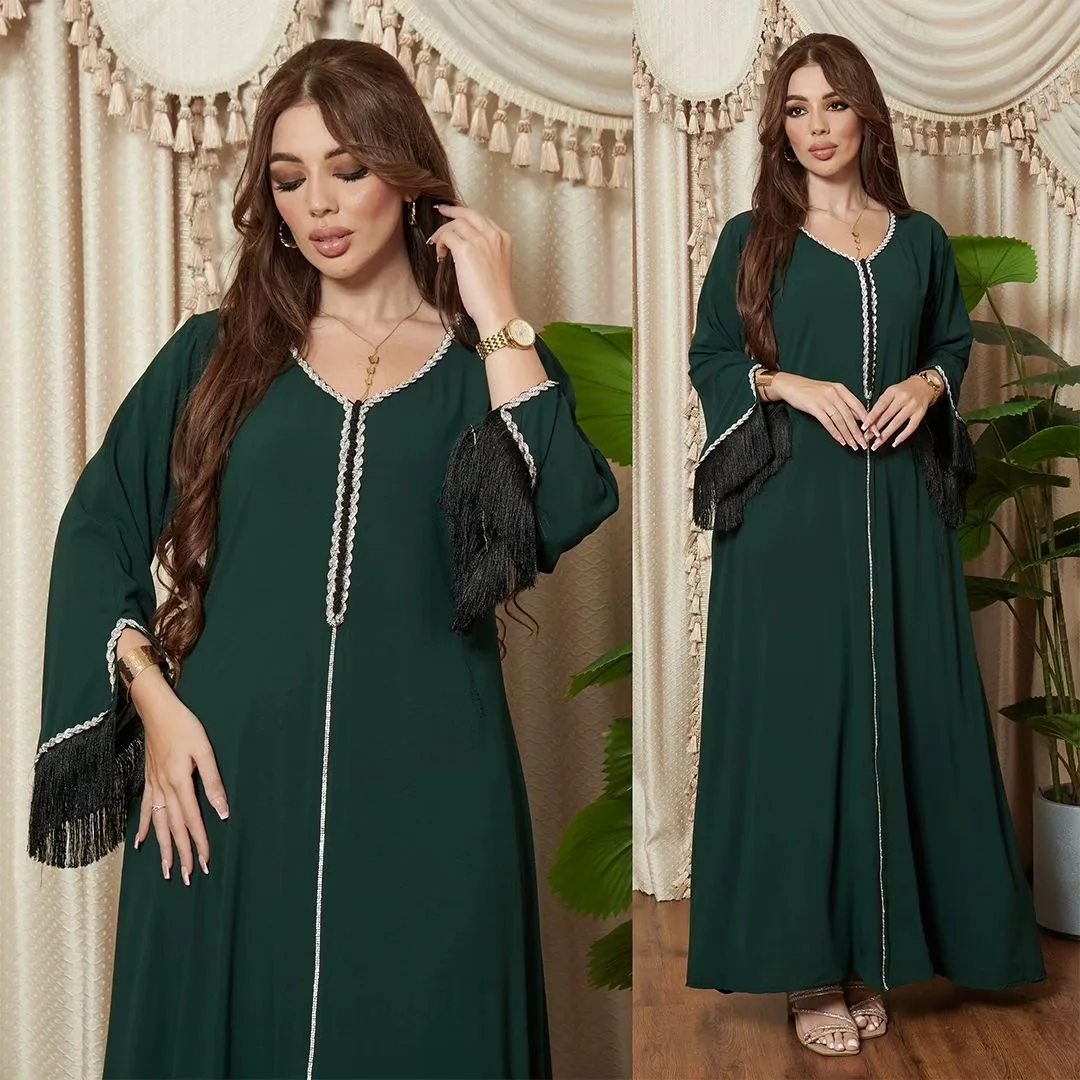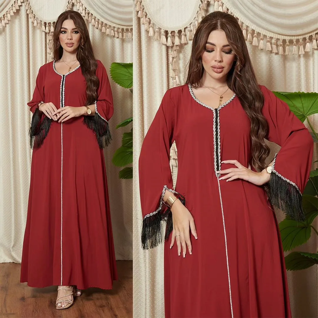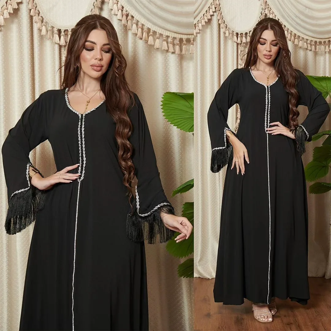 New Fashion Tassel Sleeves Women's Muslim Robes Solid Color Dubai Kaftan Casual Party Eid Abaya for Girls