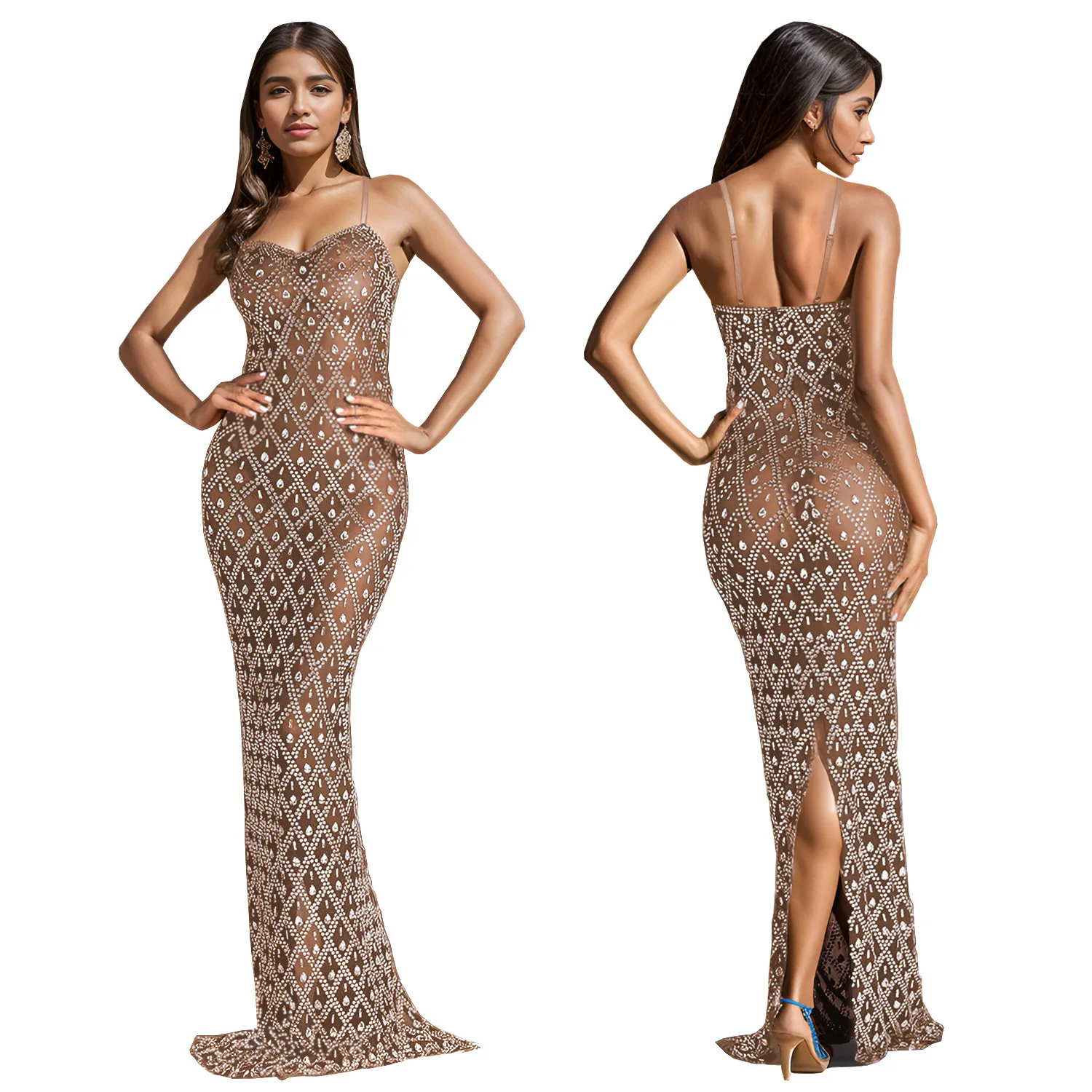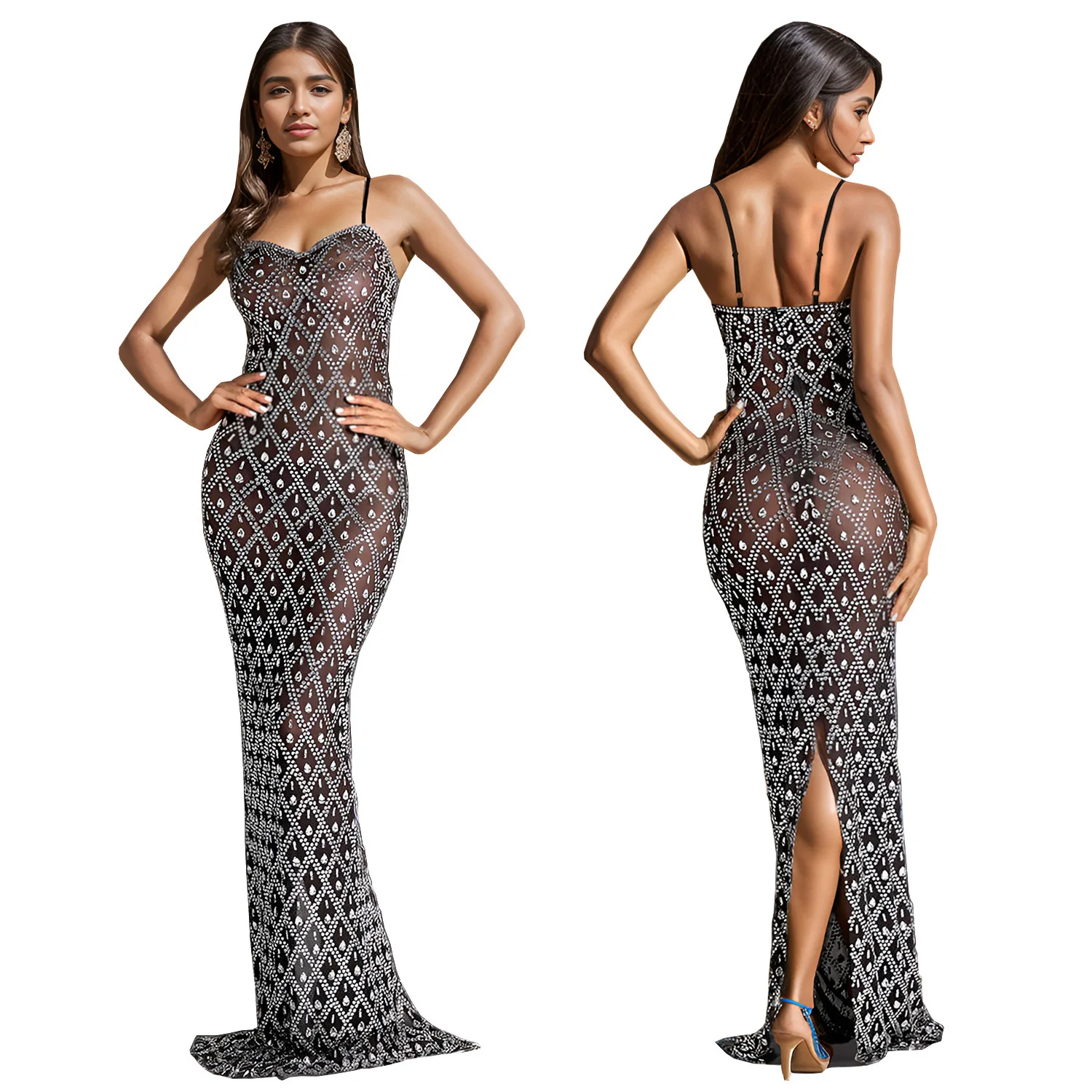 See Through Party Dresses Women Evening Elegance Club Dresses Rhinestones Shinny Long Gown Evening Dress