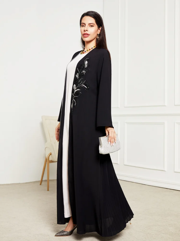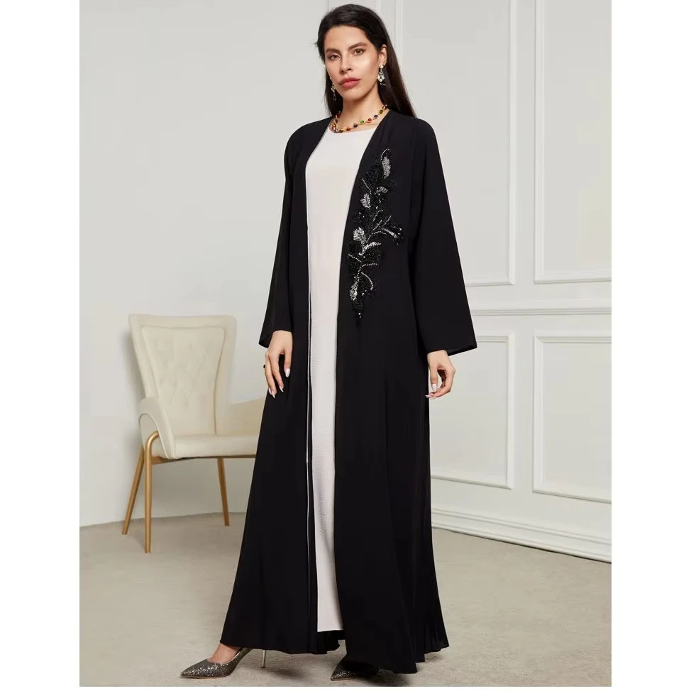 High Quality Plain Black Abaya Robe Handmade Beaded Women Muslim Dress 2024 Dubai Woman Open Abaya