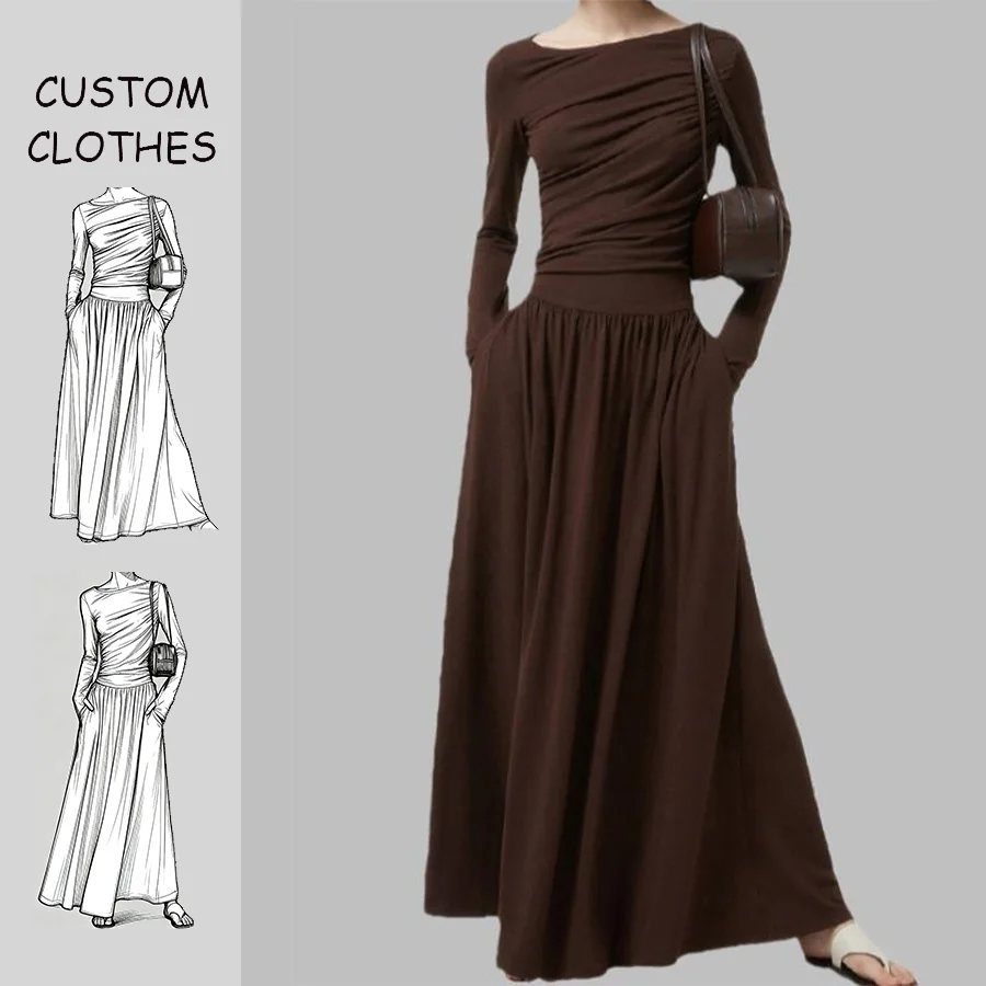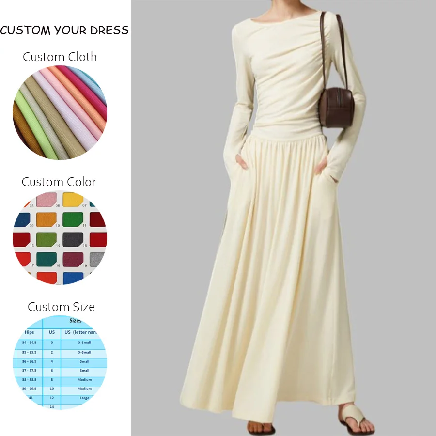 ZYHT 73849 European Wholesale Fashion Casual One Shoulder Ruched Maxi Dress Side Slit Pleated Long Sleeve Dresses for Women