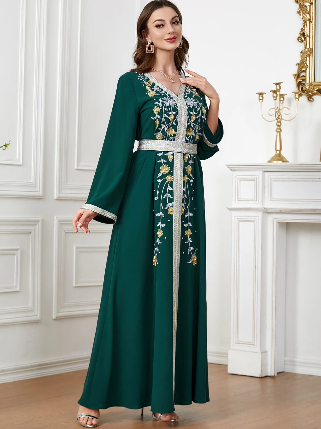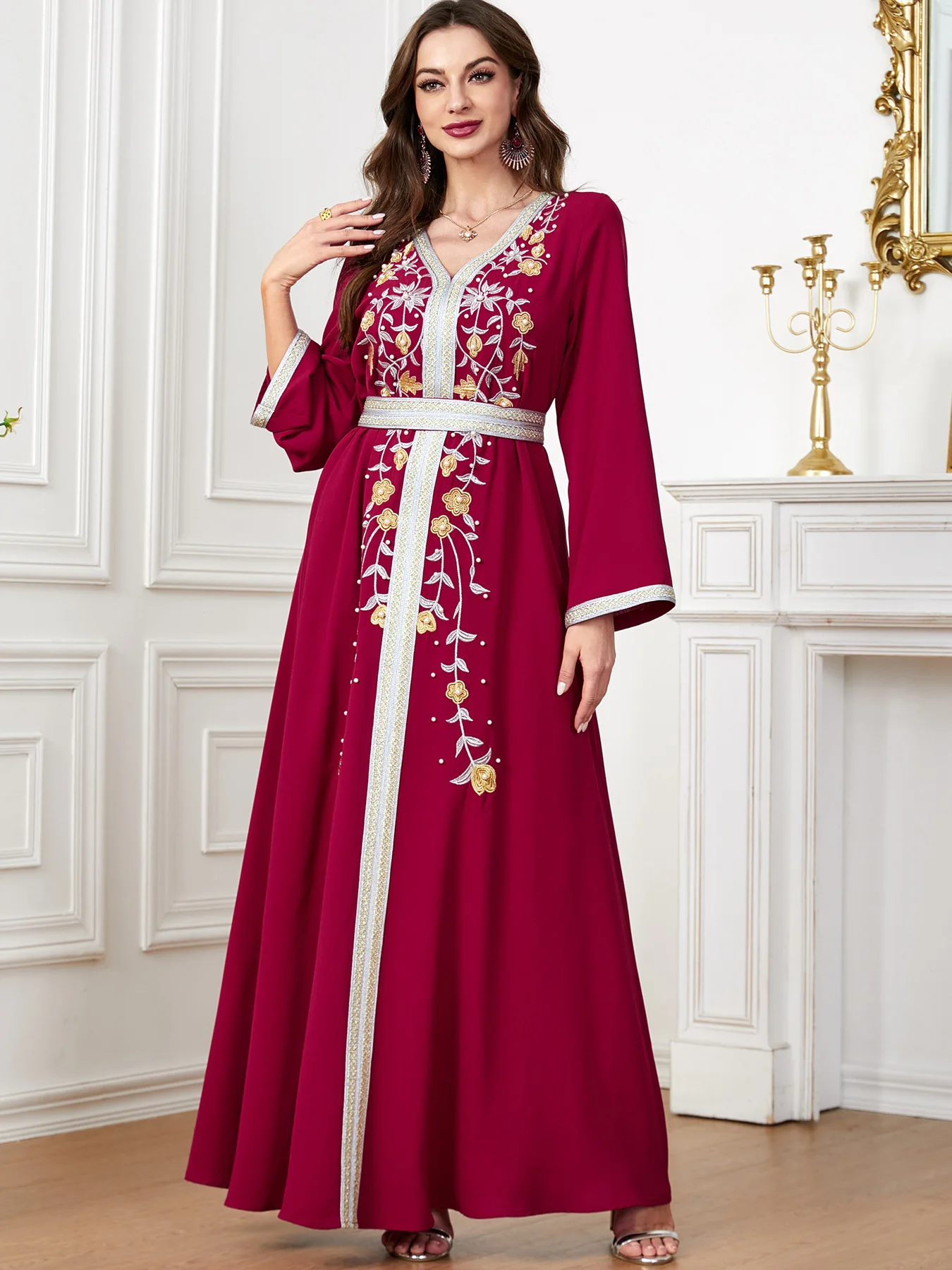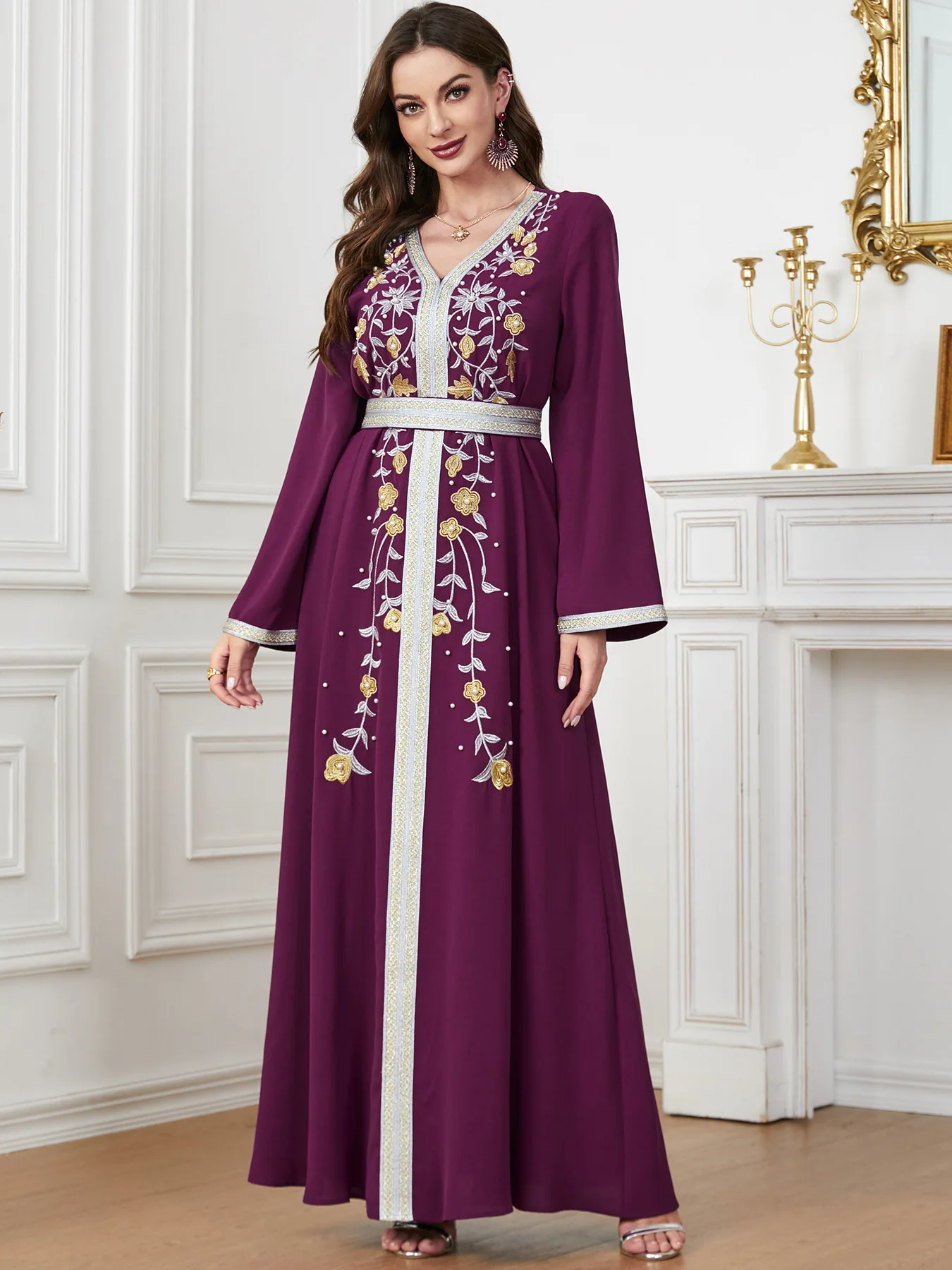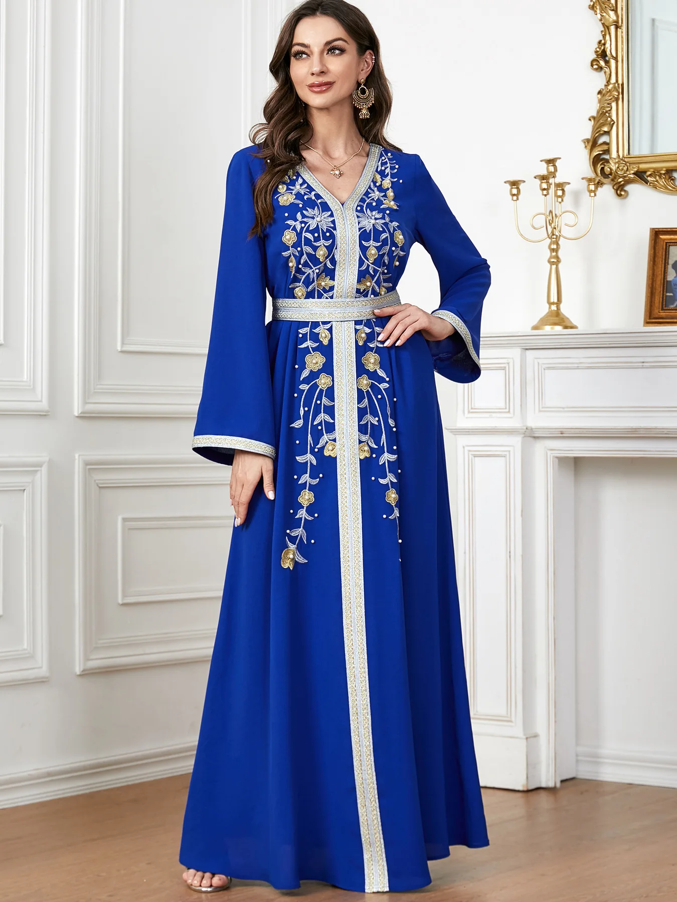 In Stock Dubai Muslim Women Abayas Luxury Embroidered Chiffon Maxi Long Turkish Party Dresses with Belt