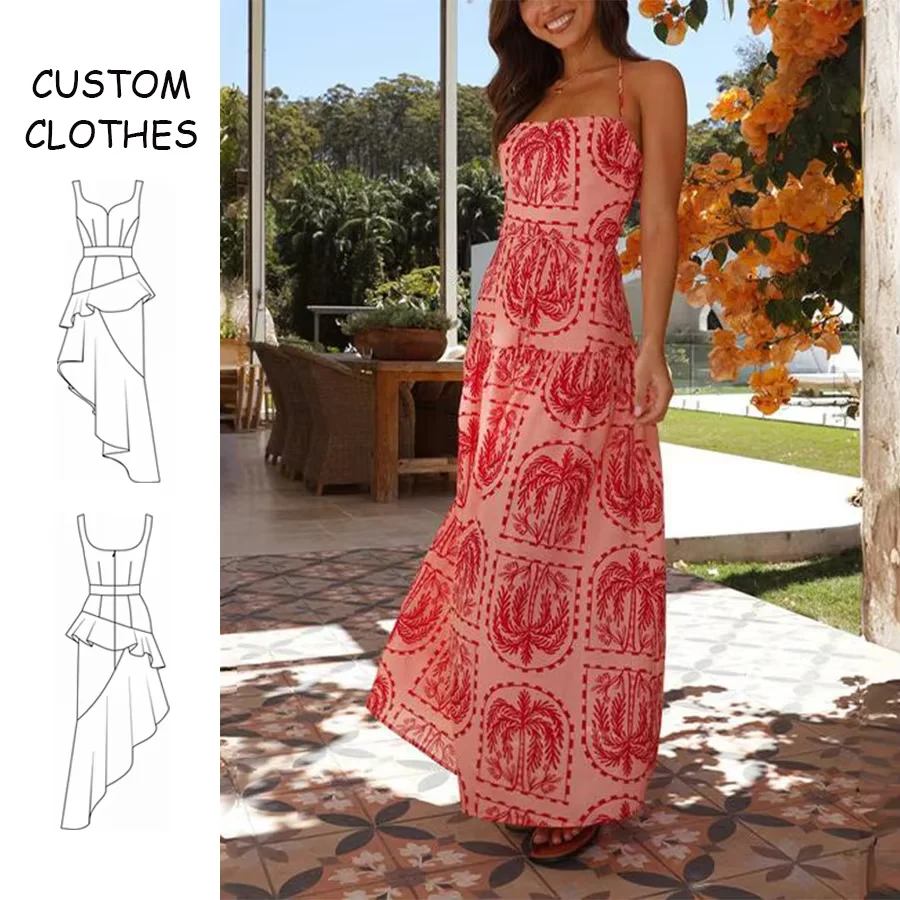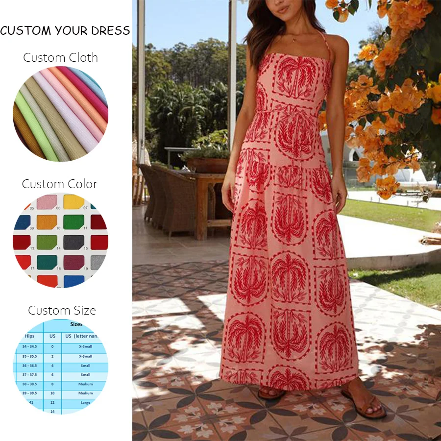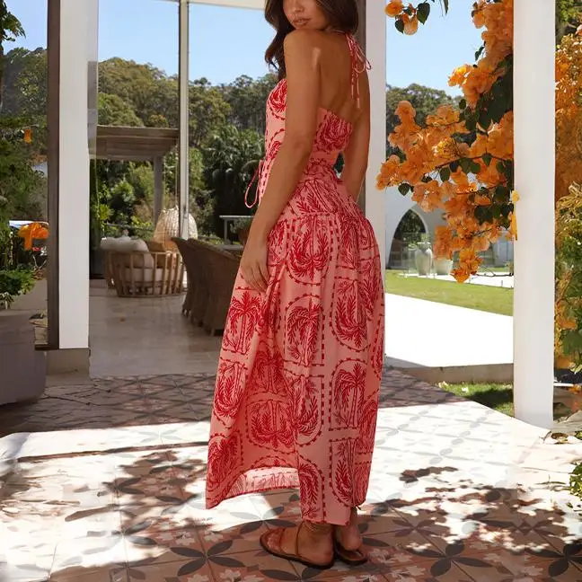 Wholesale Customized Women Casual Summer A-Line Cheap Sleeveless Printed Red Backless Hawaiian Style Halter Maxi Dress with Belt