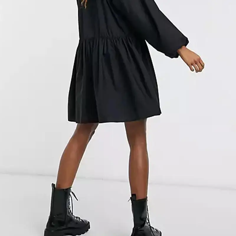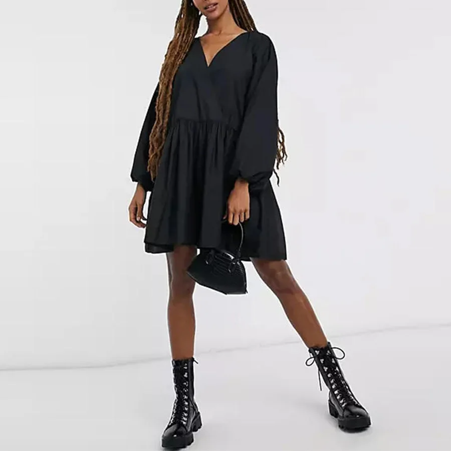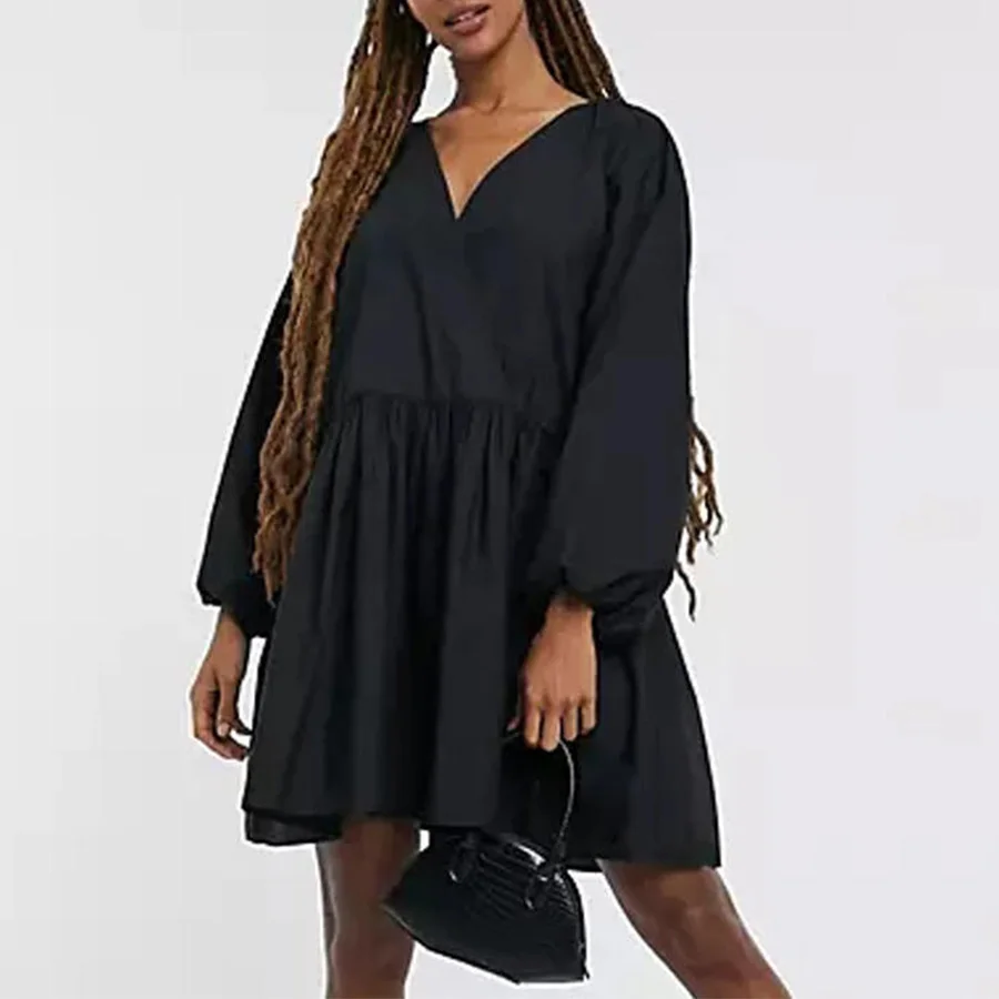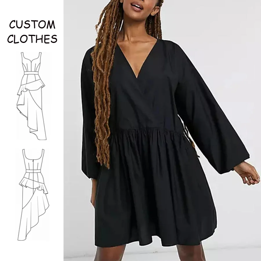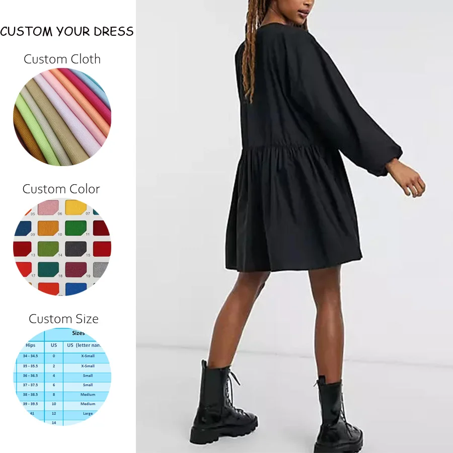 OEM Plus Size V-Neck Custom Long Sleeve Linen Cotton Ruffles Pleated Solid Casual Natural Waist Spring Autumn Woven Smock Dress