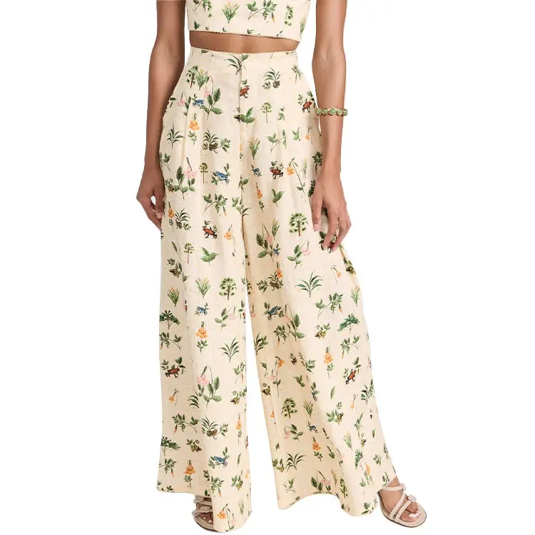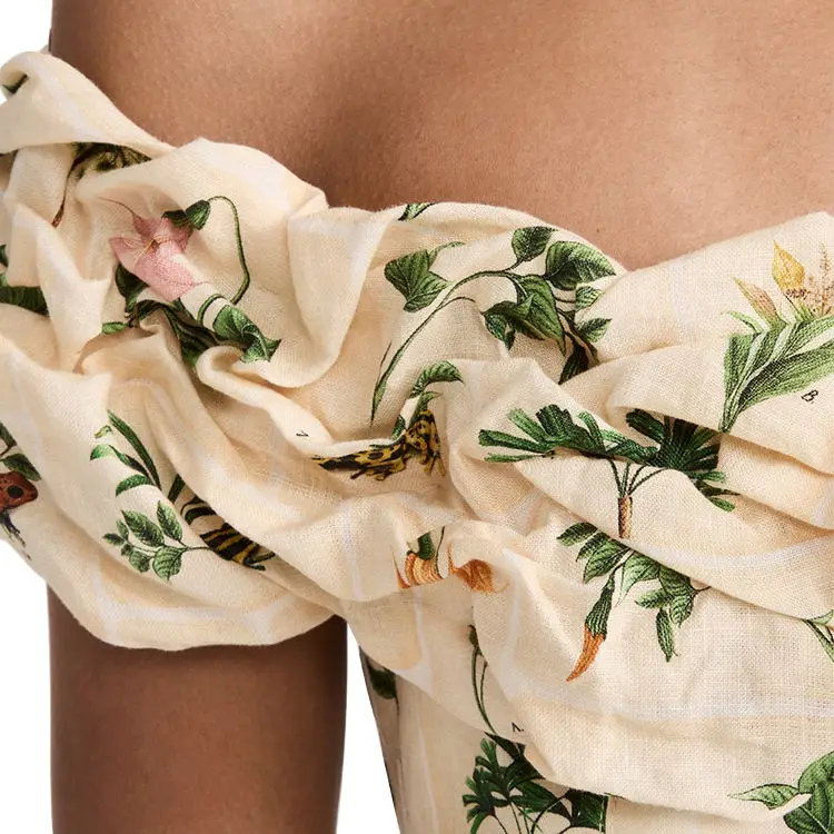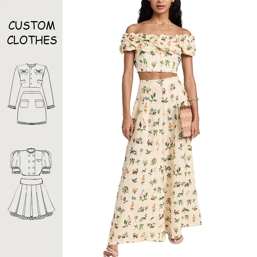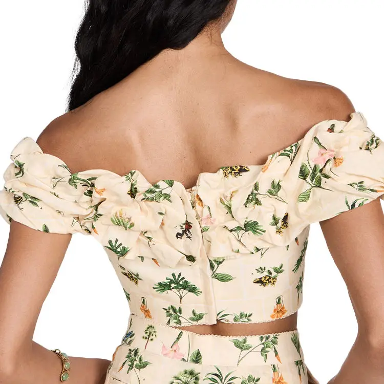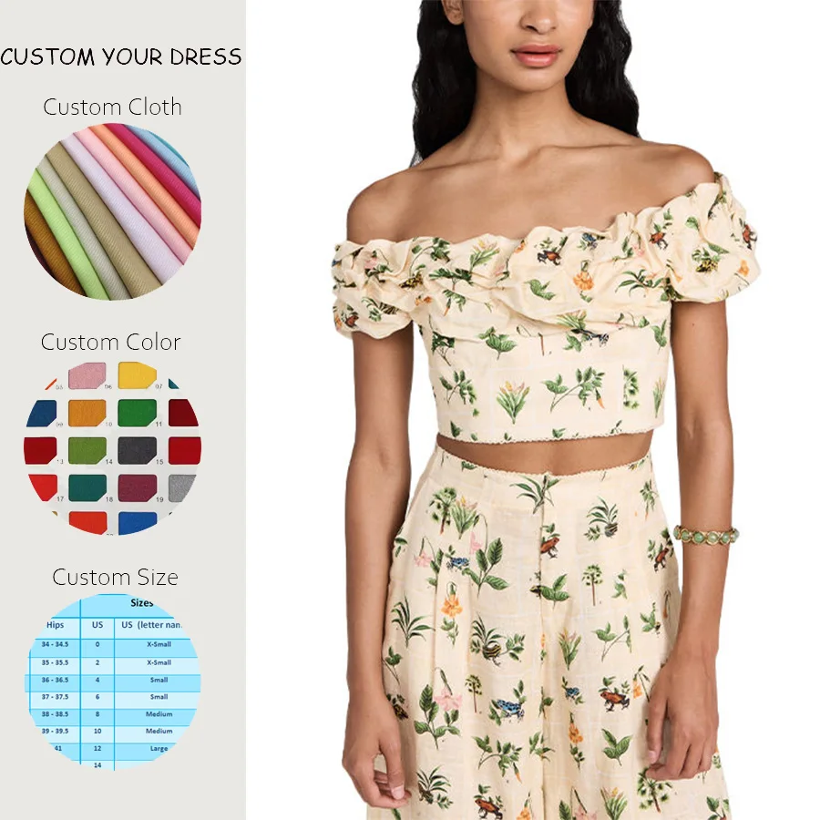 Custom Logo Summer Fashion Ladies off Shoulder Wide Leg Two Piece OEM Casual Floral Linen Top and Shorts Sets Women