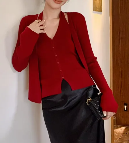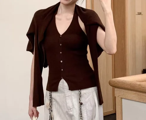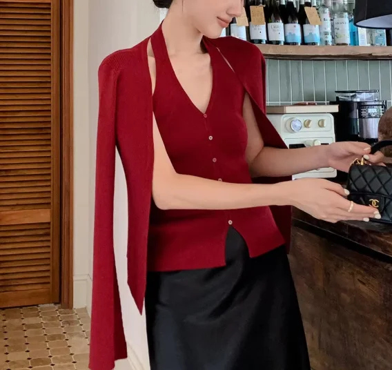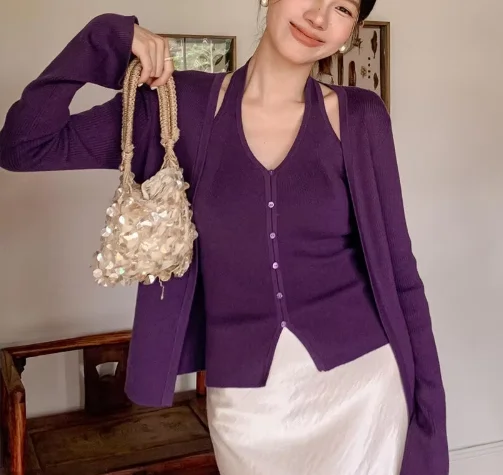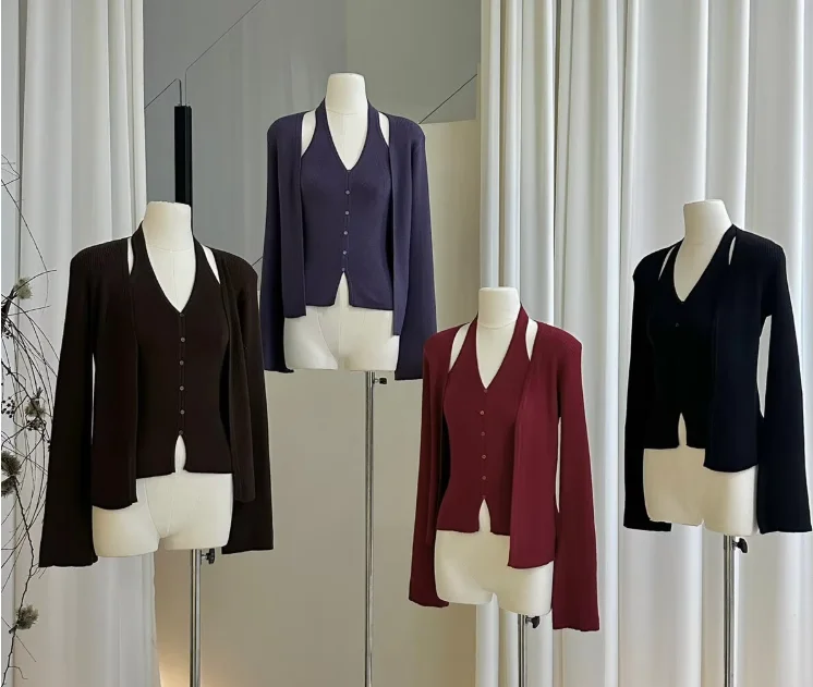 Halter Neck Knit Two-Piece Set for Women - Tank Top + Cardigan, Slim-Fit Elegant Workwear Multi-Color Set