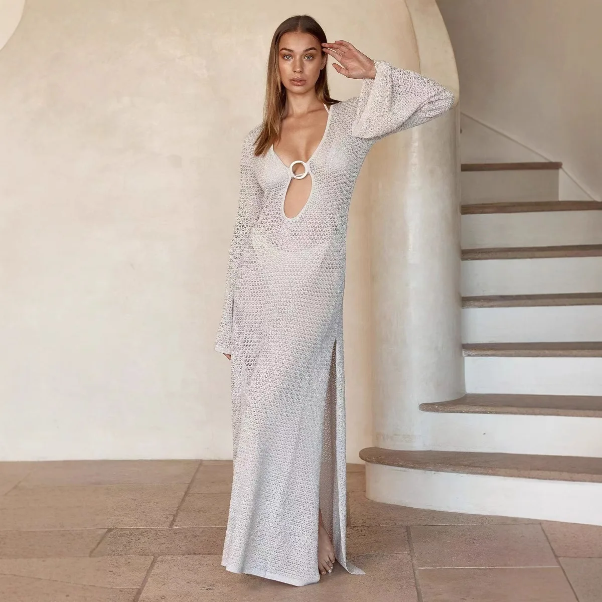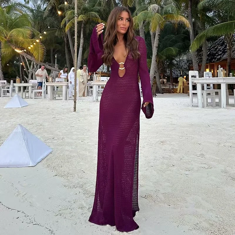 European and American Summer Sexy Hollow-Out Bell-Sleeve V-neck Breathable Knitted Solid 1 Piece Bikini Beach Vacation Dress