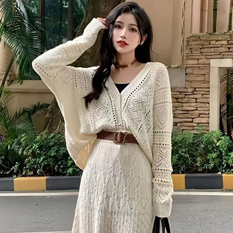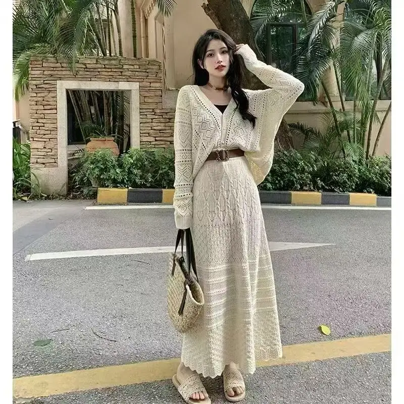 Women's Autumn Winter Long Skirt V-Neck Hollow Knit Dress New Korean Style Loose Slimming Sweater Coat Top Casual Solid Pattern